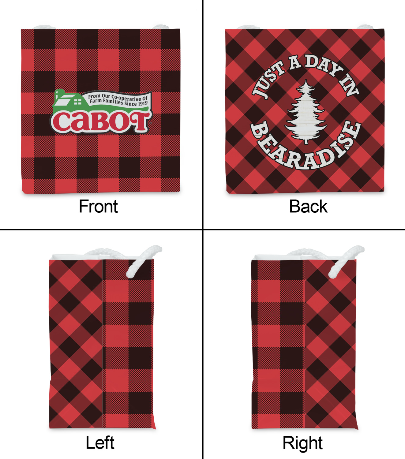 The main design is split into two asymmetrical sections. The top section is a diagonal red and black plaid, while the bottom is a light wood texture. On top of the wood texture is where your graphic and personalization go! The bear graphic and text below are filled with another black and red plaid.