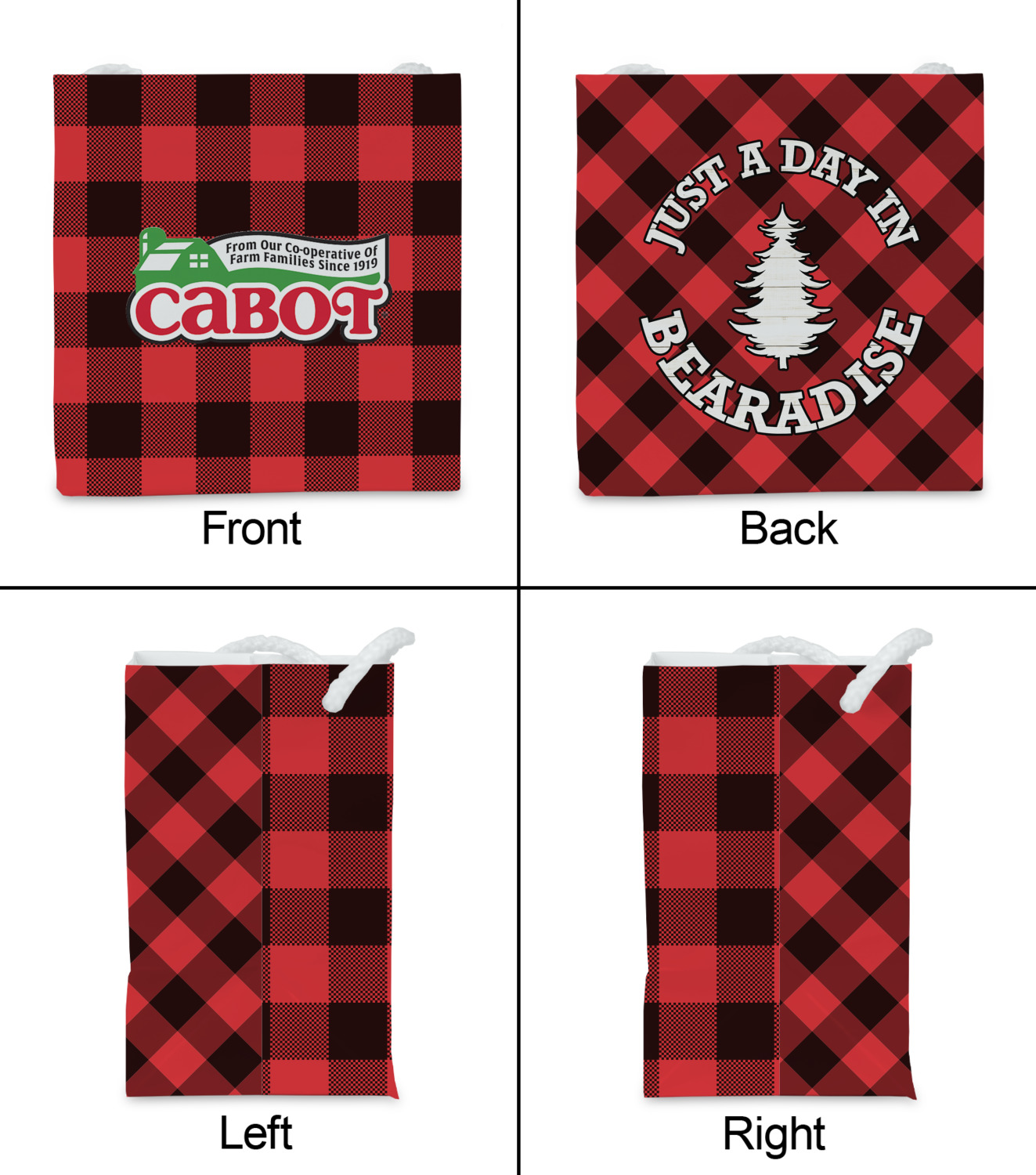 The main design is split into two asymmetrical sections. The top section is a diagonal red and black plaid, while the bottom is a light wood texture. On top of the wood texture is where your graphic and personalization go! The bear graphic and text below are filled with another black and red plaid.