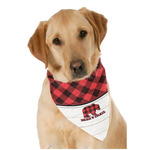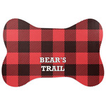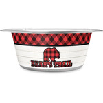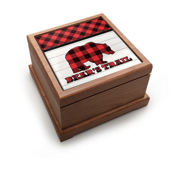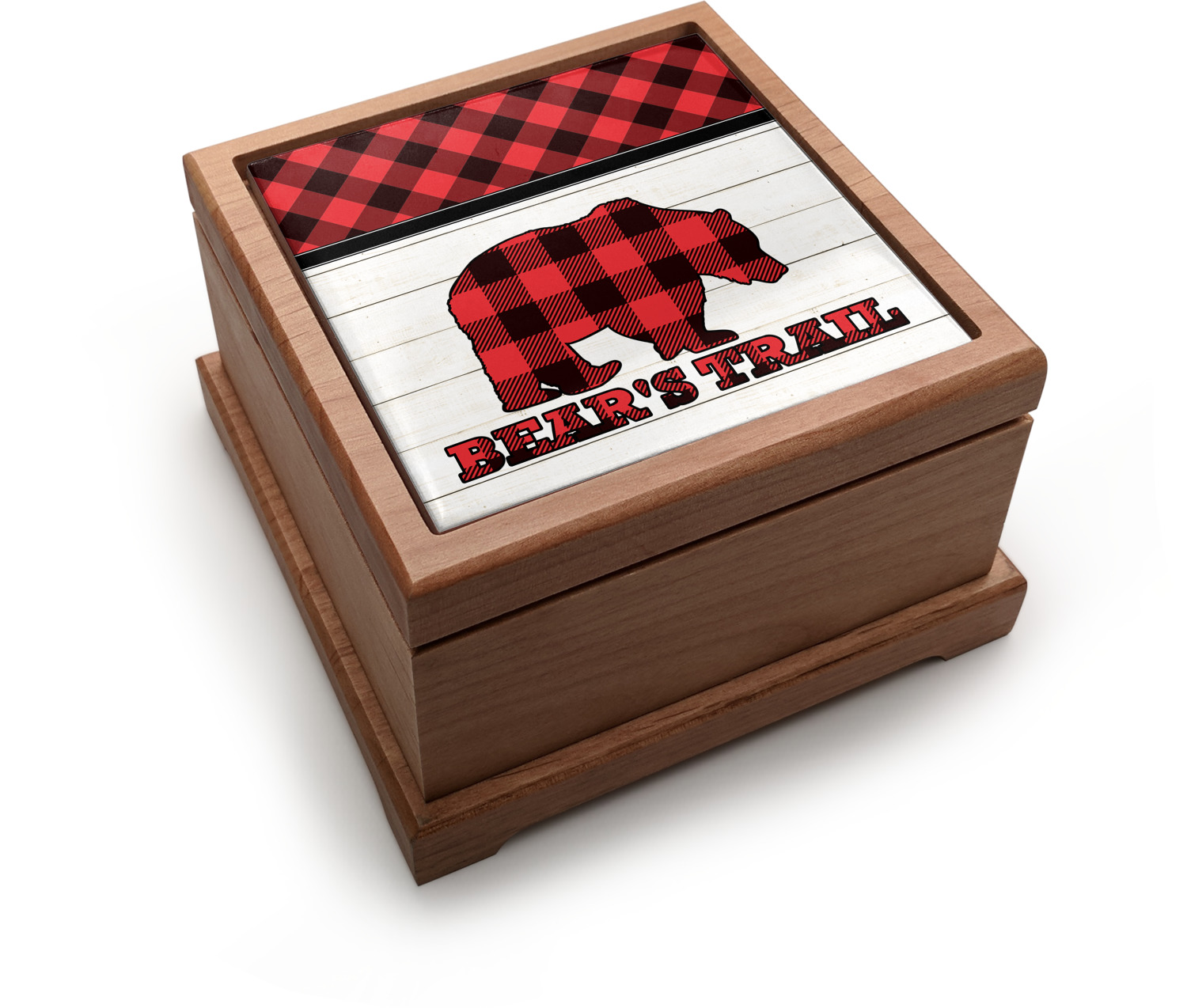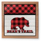 The main design is split into two asymmetrical sections. The top section is a diagonal red and black plaid, while the bottom is a light wood texture. On top of the wood texture is where your graphic and personalization go! The bear graphic and text below are filled with another black and red plaid.