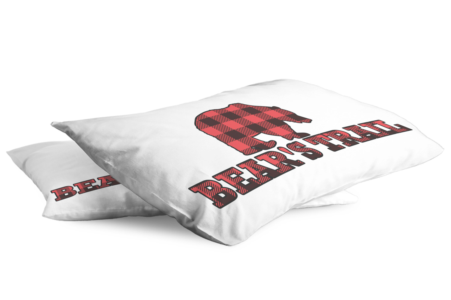The main design is split into two asymmetrical sections. The top section is a diagonal red and black plaid, while the bottom is a light wood texture. On top of the wood texture is where your graphic and personalization go! The bear graphic and text below are filled with another black and red plaid.