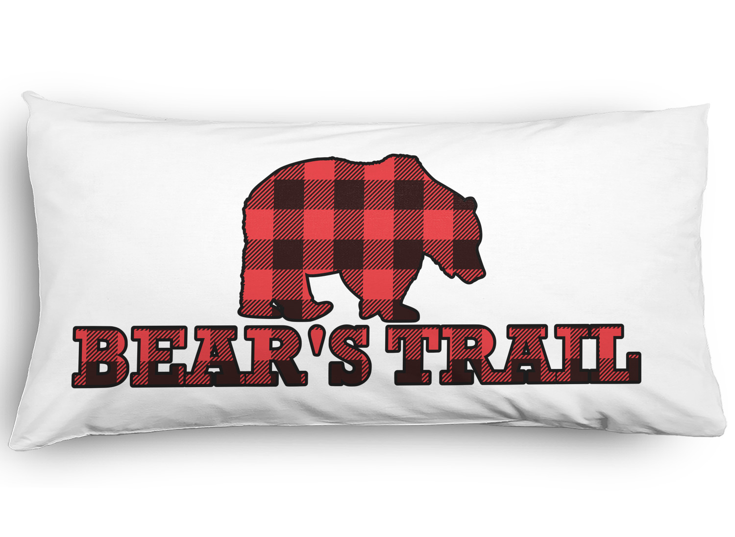 The main design is split into two asymmetrical sections. The top section is a diagonal red and black plaid, while the bottom is a light wood texture. On top of the wood texture is where your graphic and personalization go! The bear graphic and text below are filled with another black and red plaid.