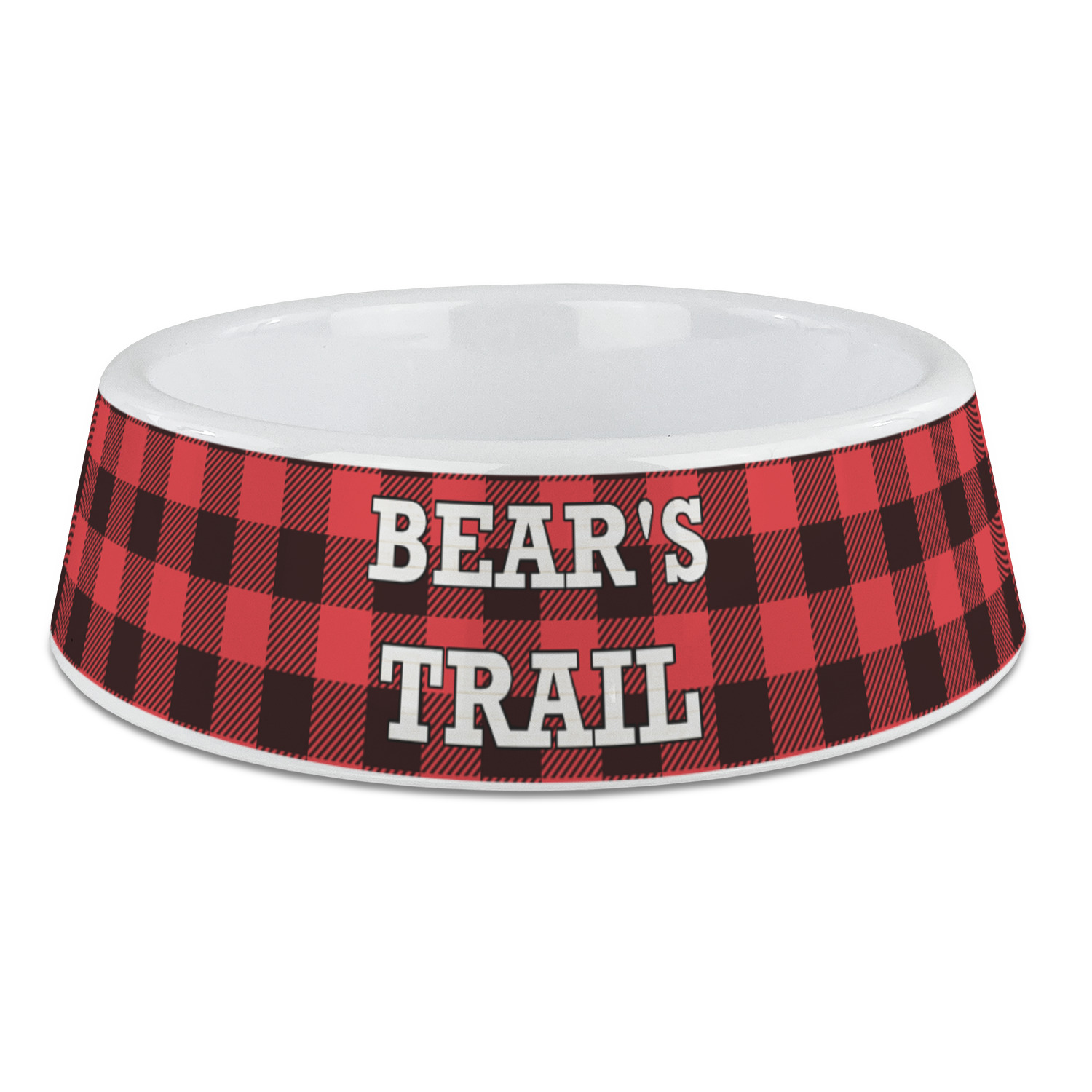The main design is split into two asymmetrical sections. The top section is a diagonal red and black plaid, while the bottom is a light wood texture. On top of the wood texture is where your graphic and personalization go! The bear graphic and text below are filled with another black and red plaid.