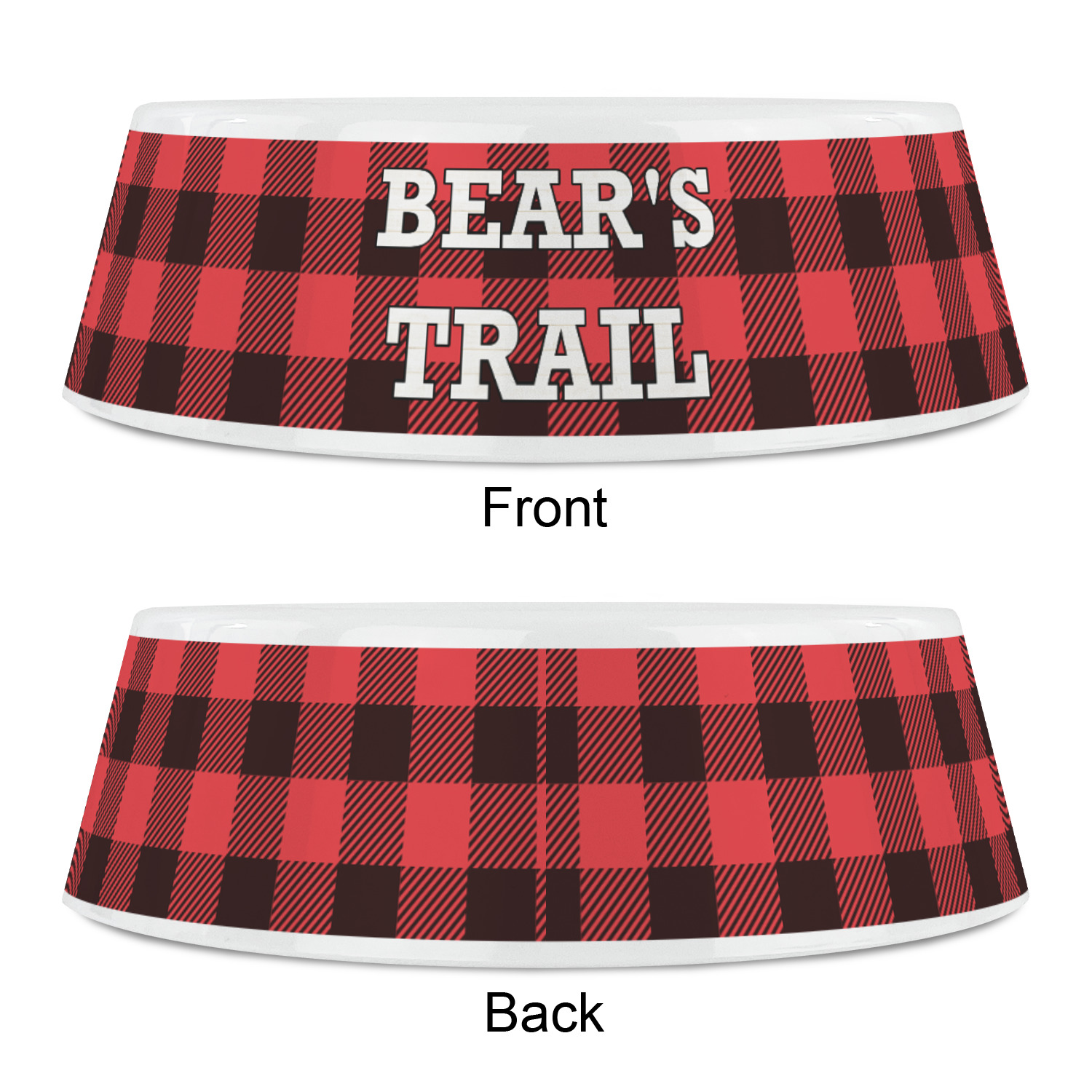 The main design is split into two asymmetrical sections. The top section is a diagonal red and black plaid, while the bottom is a light wood texture. On top of the wood texture is where your graphic and personalization go! The bear graphic and text below are filled with another black and red plaid.