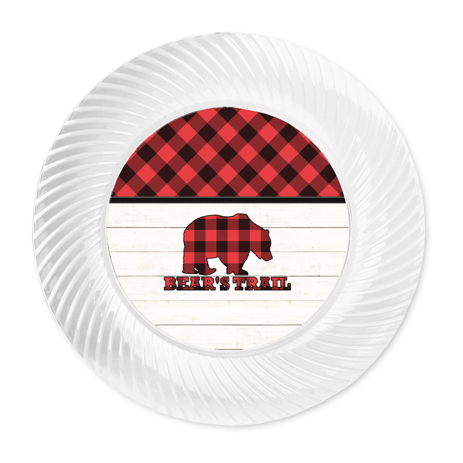 The main design is split into two asymmetrical sections. The top section is a diagonal red and black plaid, while the bottom is a light wood texture. On top of the wood texture is where your graphic and personalization go! The bear graphic and text below are filled with another black and red plaid.