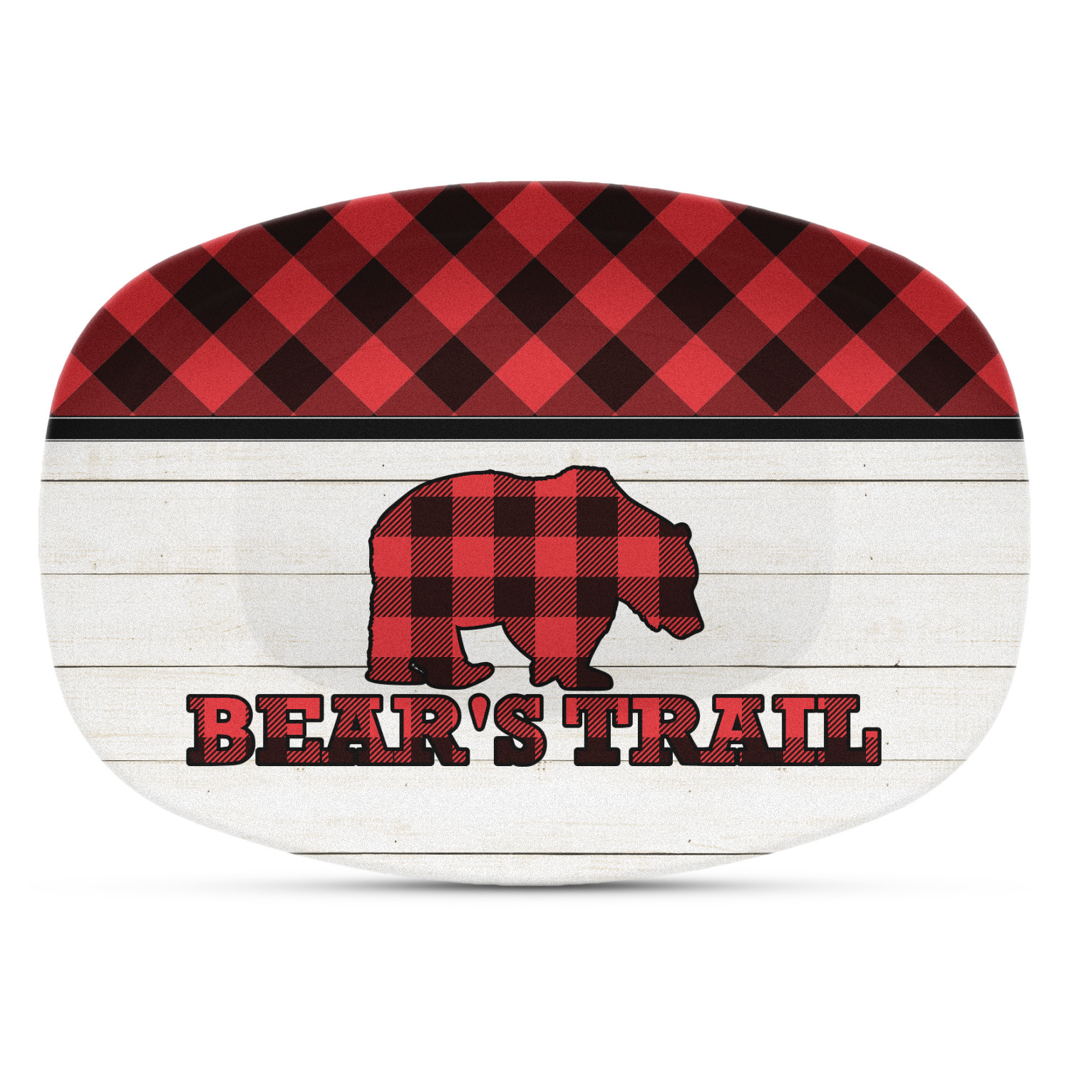 The main design is split into two asymmetrical sections. The top section is a diagonal red and black plaid, while the bottom is a light wood texture. On top of the wood texture is where your graphic and personalization go! The bear graphic and text below are filled with another black and red plaid.