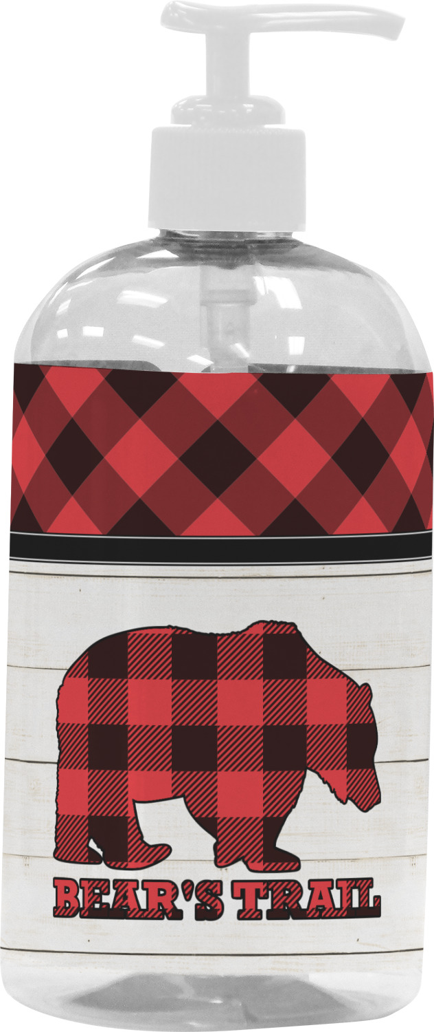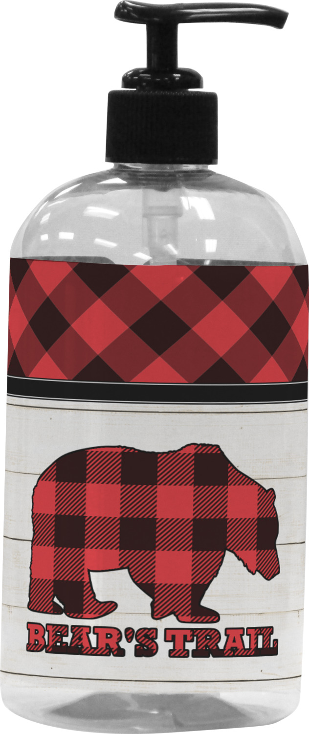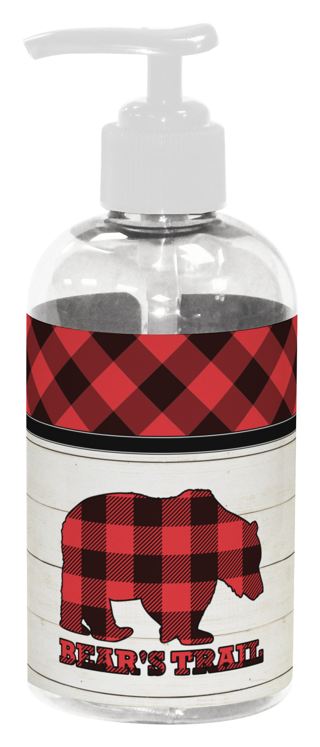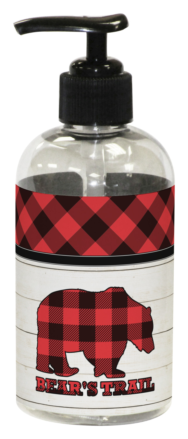 The main design is split into two asymmetrical sections. The top section is a diagonal red and black plaid, while the bottom is a light wood texture. On top of the wood texture is where your graphic and personalization go! The bear graphic and text below are filled with another black and red plaid.