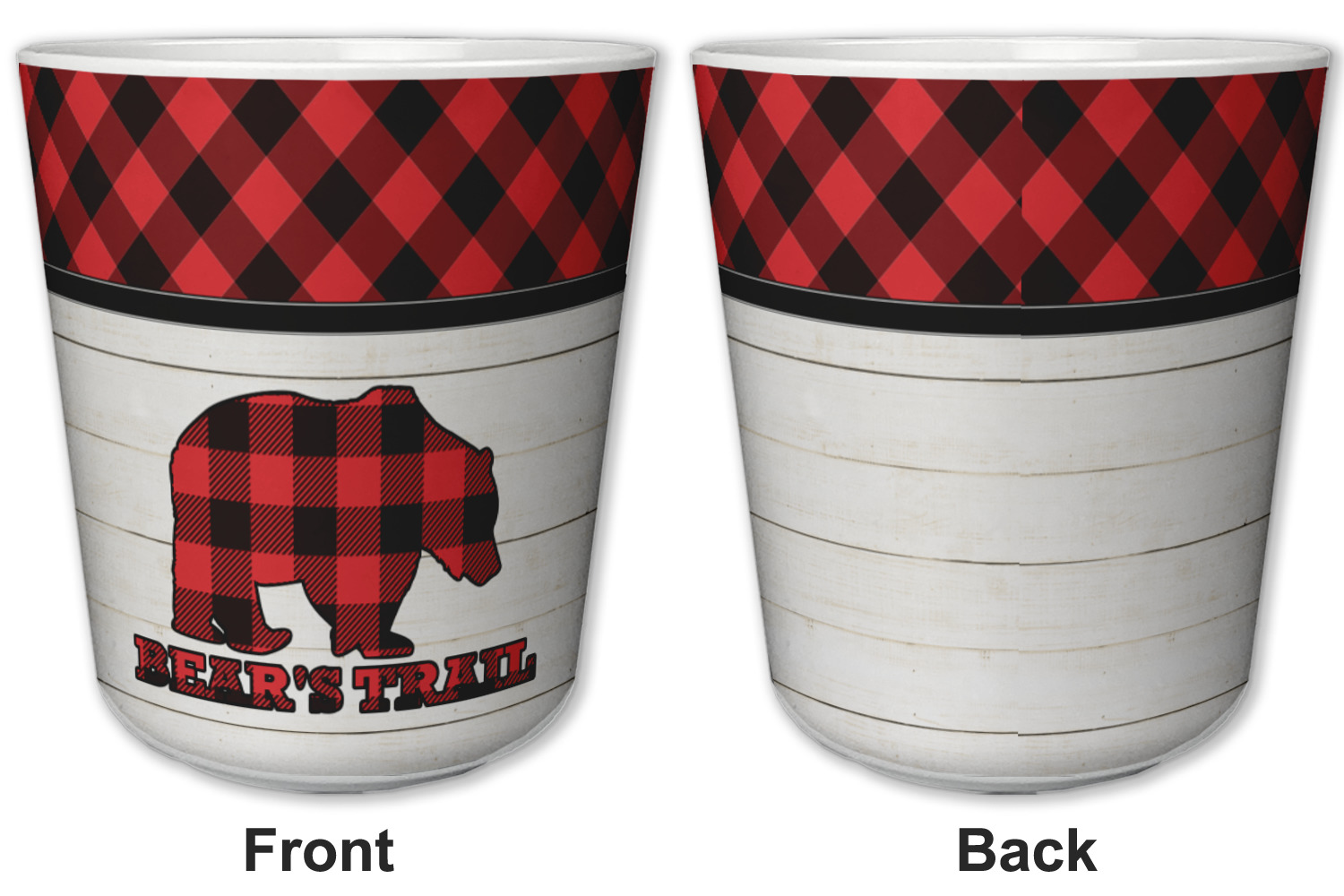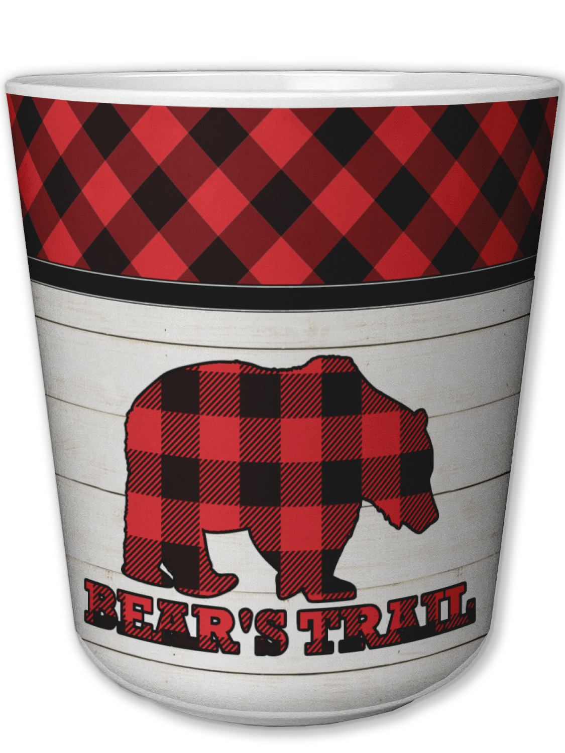 The main design is split into two asymmetrical sections. The top section is a diagonal red and black plaid, while the bottom is a light wood texture. On top of the wood texture is where your graphic and personalization go! The bear graphic and text below are filled with another black and red plaid.
