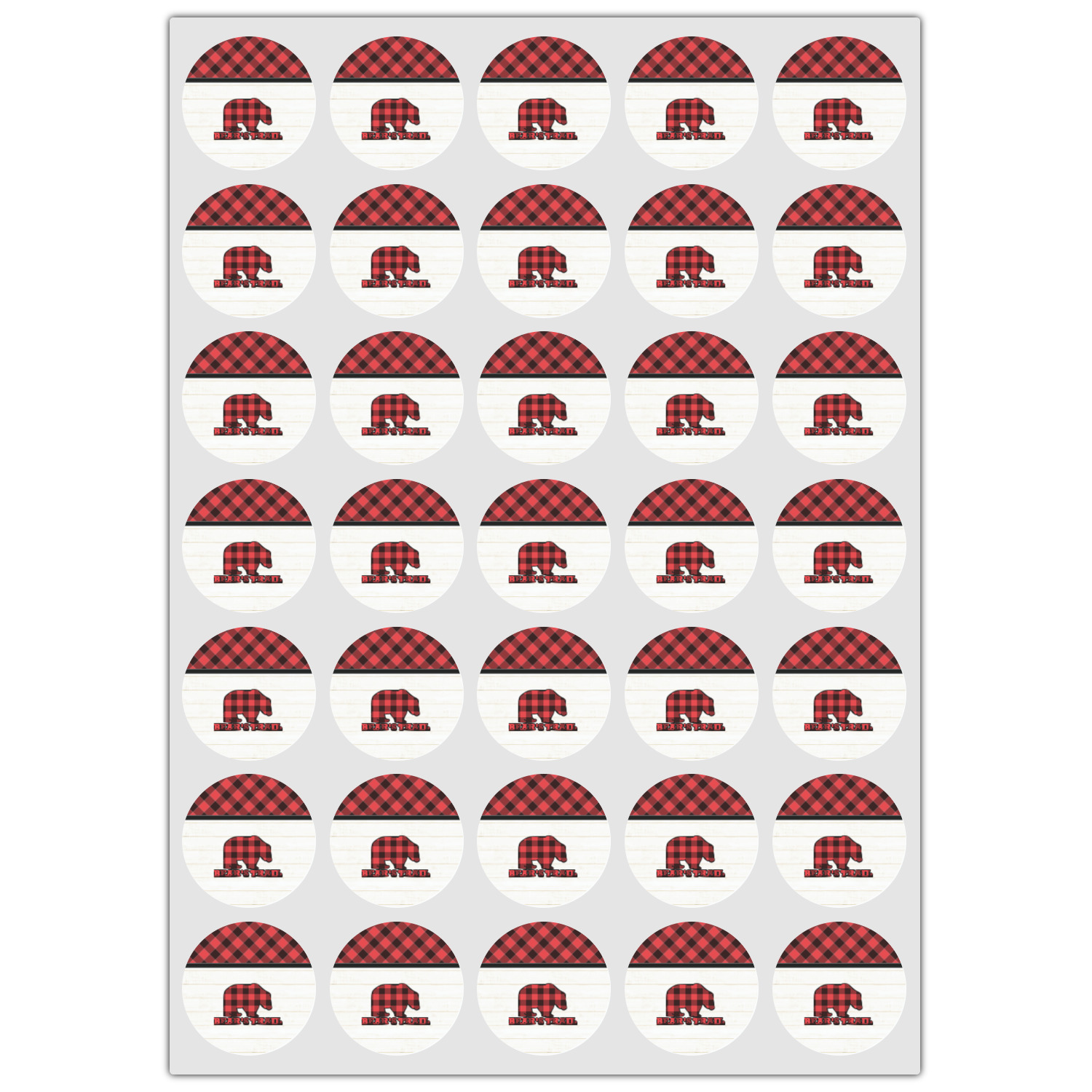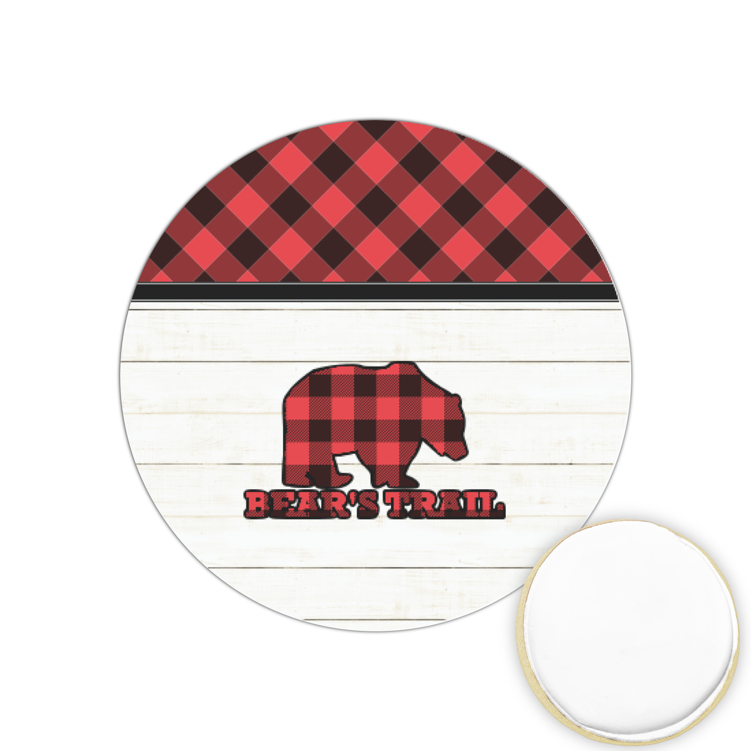 The main design is split into two asymmetrical sections. The top section is a diagonal red and black plaid, while the bottom is a light wood texture. On top of the wood texture is where your graphic and personalization go! The bear graphic and text below are filled with another black and red plaid.