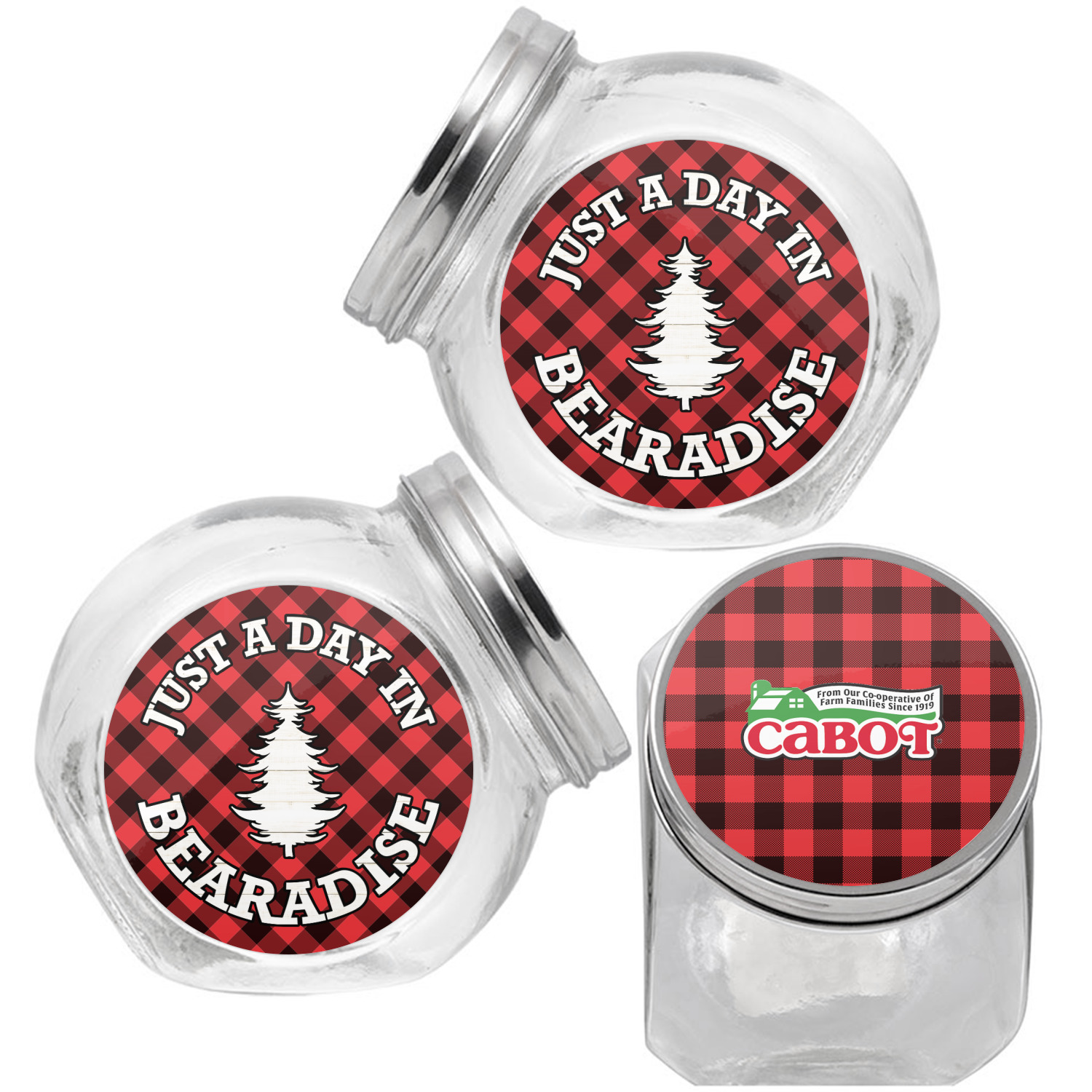 This treat jar is an excellent way to store treats for your favorite canine or feline. Moreover, their delicate, classy appearance makes them a tasteful addition to your countertop's décor. Crafted from clear glass, its unique construction and silver metal, screw-on lid allows for quick and easy access. Three, permanent, vinyl stickers are applied to both sides of the jar and lid, presenting your personalized design. The base of this glass, dog treat jar is 3.4" x 4.75", and the jar stands at 5" tall. Though on the smaller side, this jar is best suited for smaller treats or training treats.