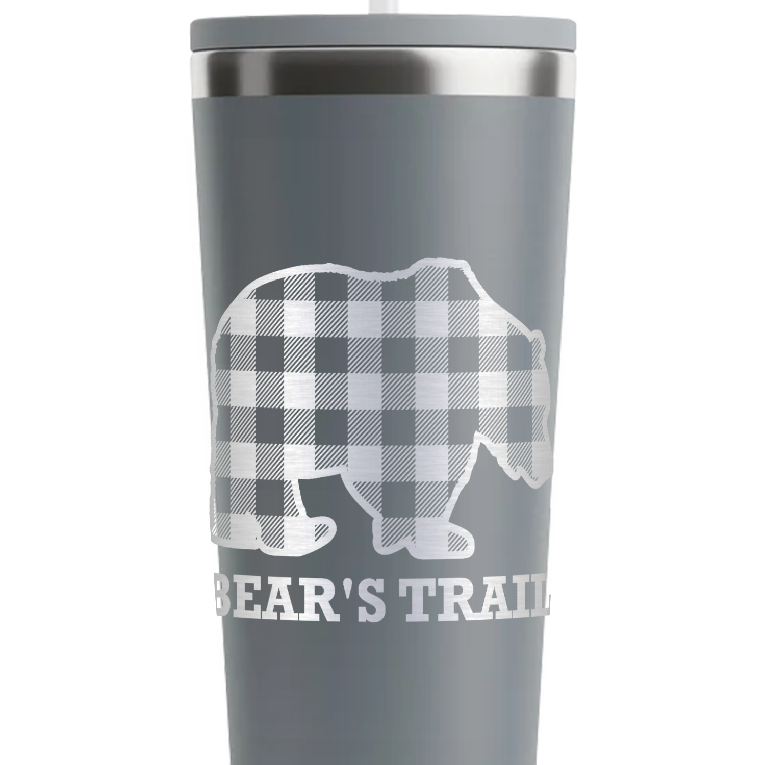 The main design is split into two asymmetrical sections. The top section is a diagonal red and black plaid, while the bottom is a light wood texture. On top of the wood texture is where your graphic and personalization go! The bear graphic and text below are filled with another black and red plaid.