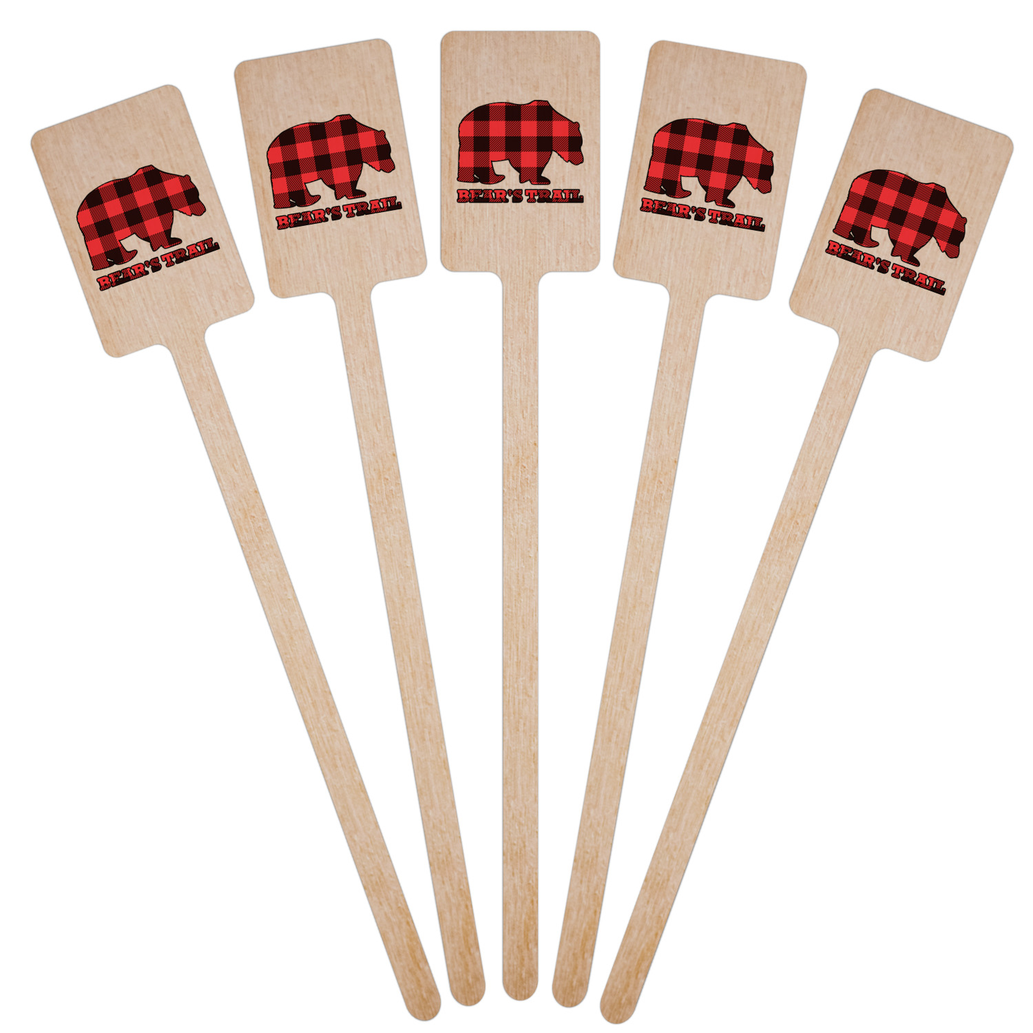 The main design is split into two asymmetrical sections. The top section is a diagonal red and black plaid, while the bottom is a light wood texture. On top of the wood texture is where your graphic and personalization go! The bear graphic and text below are filled with another black and red plaid.