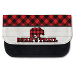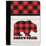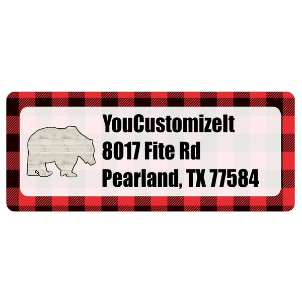 The main design is split into two asymmetrical sections. The top section is a diagonal red and black plaid, while the bottom is a light wood texture. On top of the wood texture is where your graphic and personalization go! The bear graphic and text below are filled with another black and red plaid.