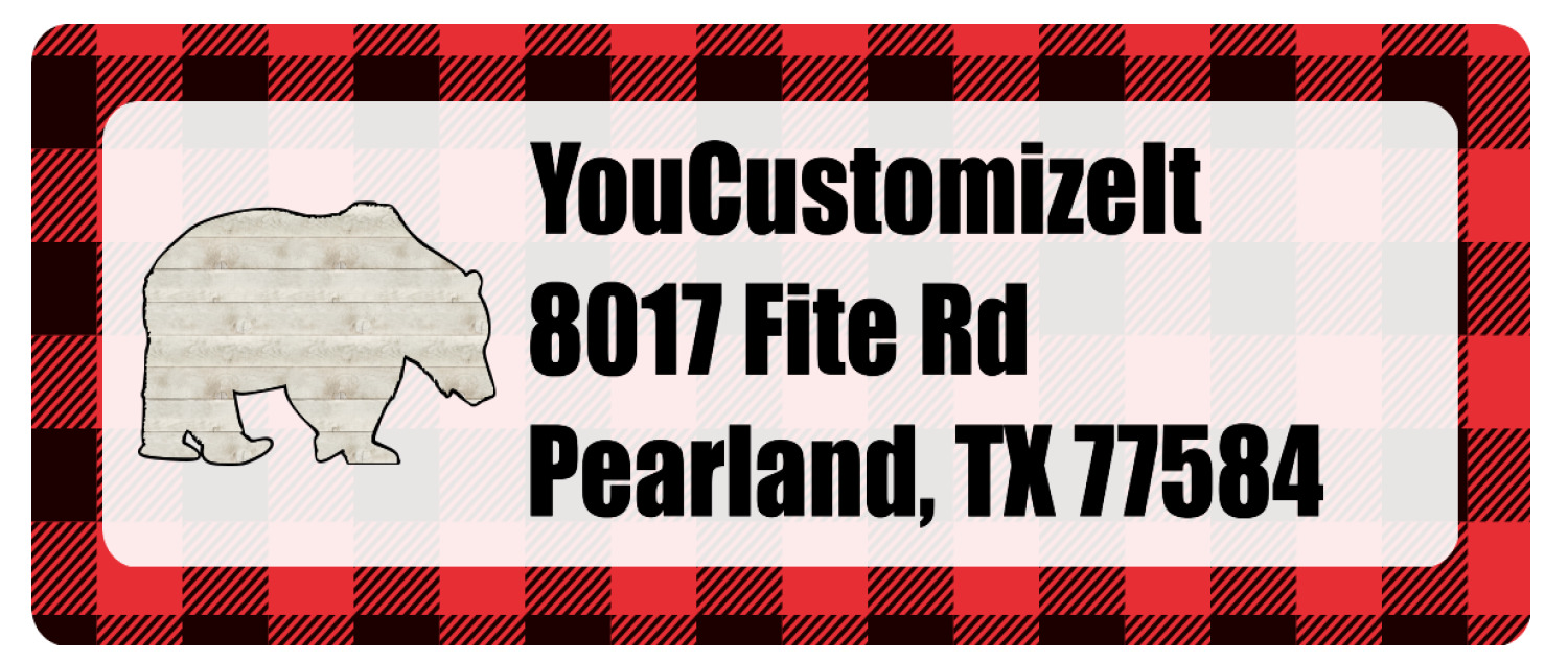 The main design is split into two asymmetrical sections. The top section is a diagonal red and black plaid, while the bottom is a light wood texture. On top of the wood texture is where your graphic and personalization go! The bear graphic and text below are filled with another black and red plaid.
