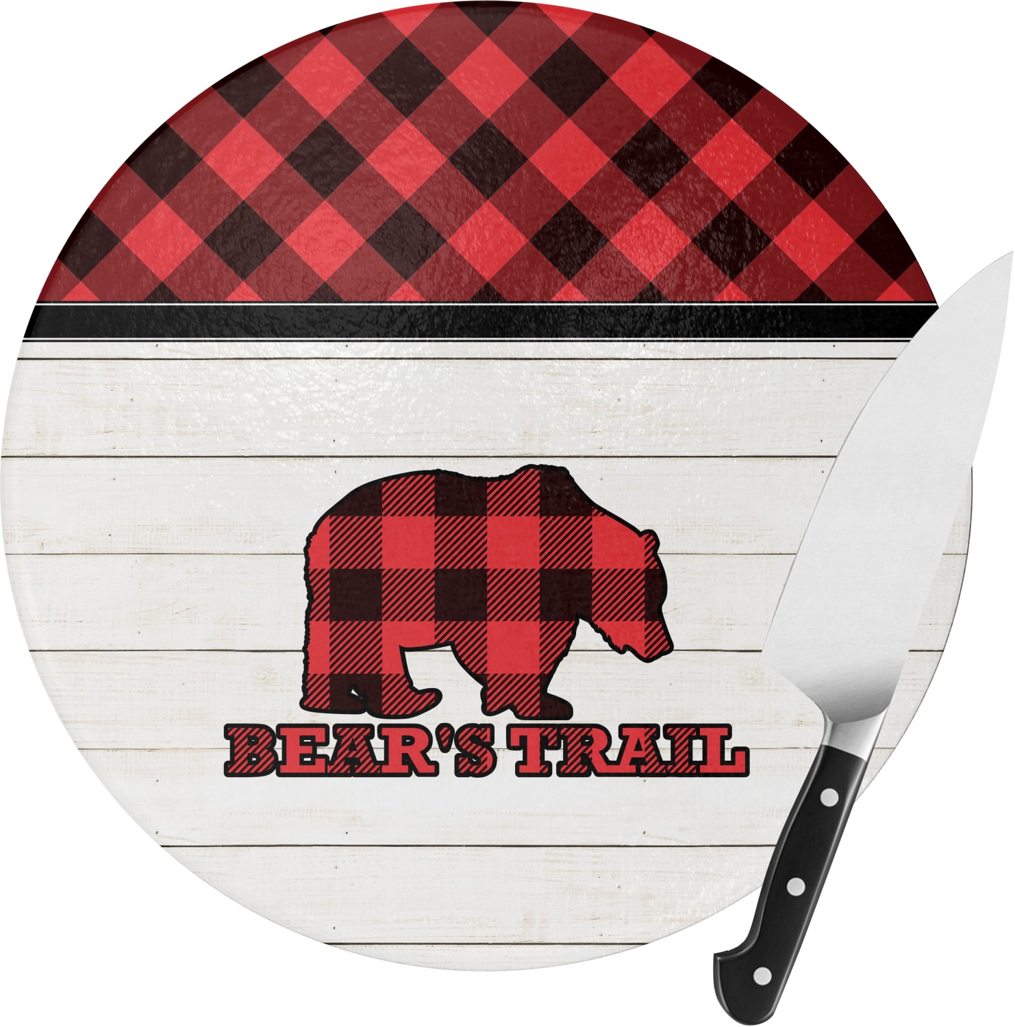 The main design is split into two asymmetrical sections. The top section is a diagonal red and black plaid, while the bottom is a light wood texture. On top of the wood texture is where your graphic and personalization go! The bear graphic and text below are filled with another black and red plaid.