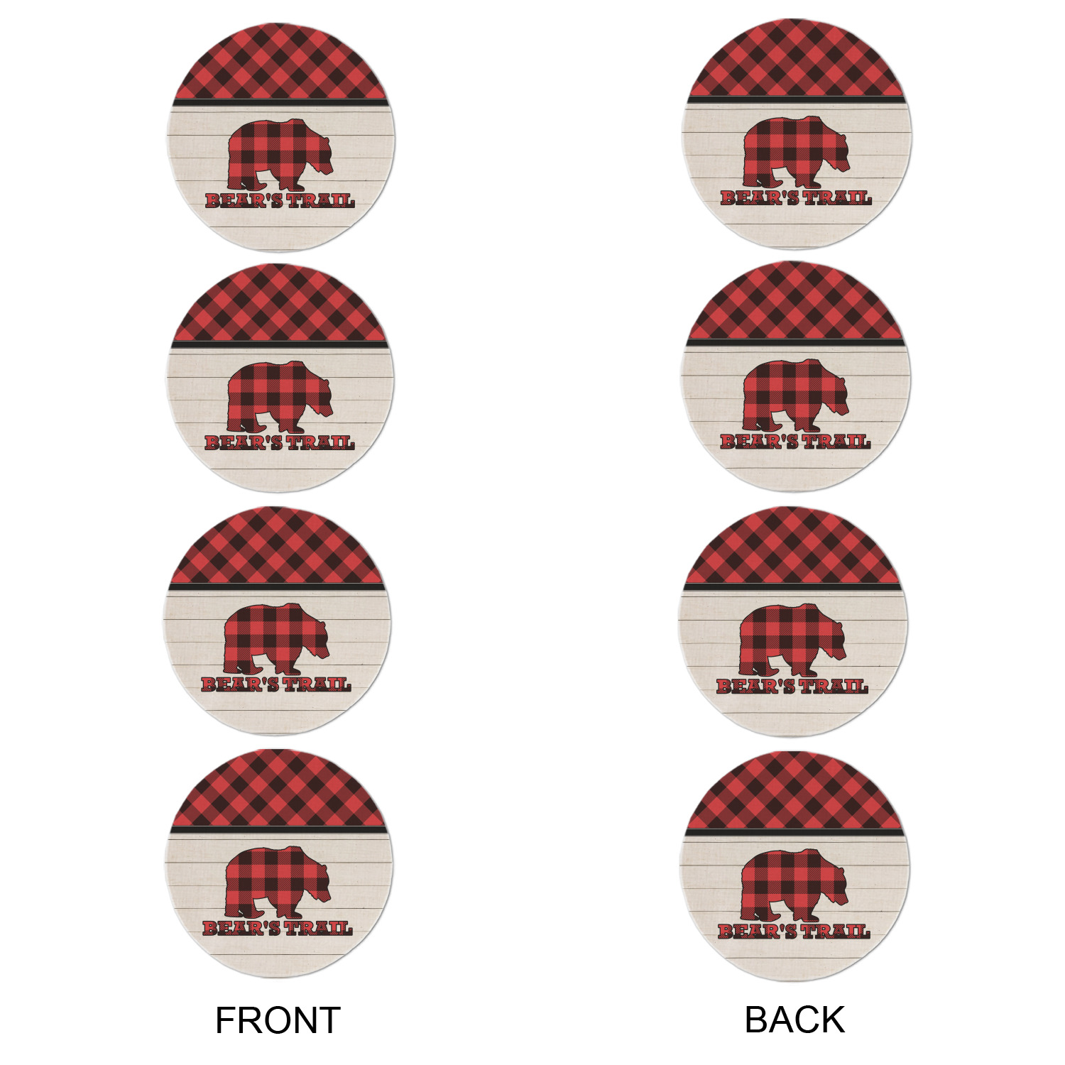 The main design is split into two asymmetrical sections. The top section is a diagonal red and black plaid, while the bottom is a light wood texture. On top of the wood texture is where your graphic and personalization go! The bear graphic and text below are filled with another black and red plaid.