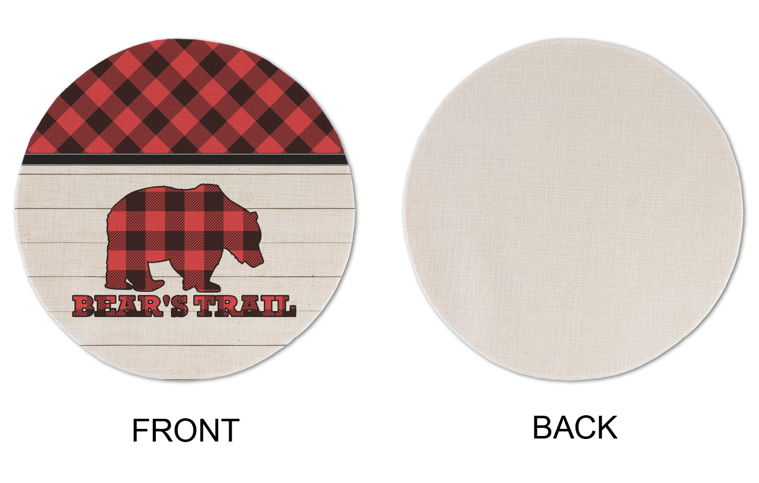 The main design is split into two asymmetrical sections. The top section is a diagonal red and black plaid, while the bottom is a light wood texture. On top of the wood texture is where your graphic and personalization go! The bear graphic and text below are filled with another black and red plaid.