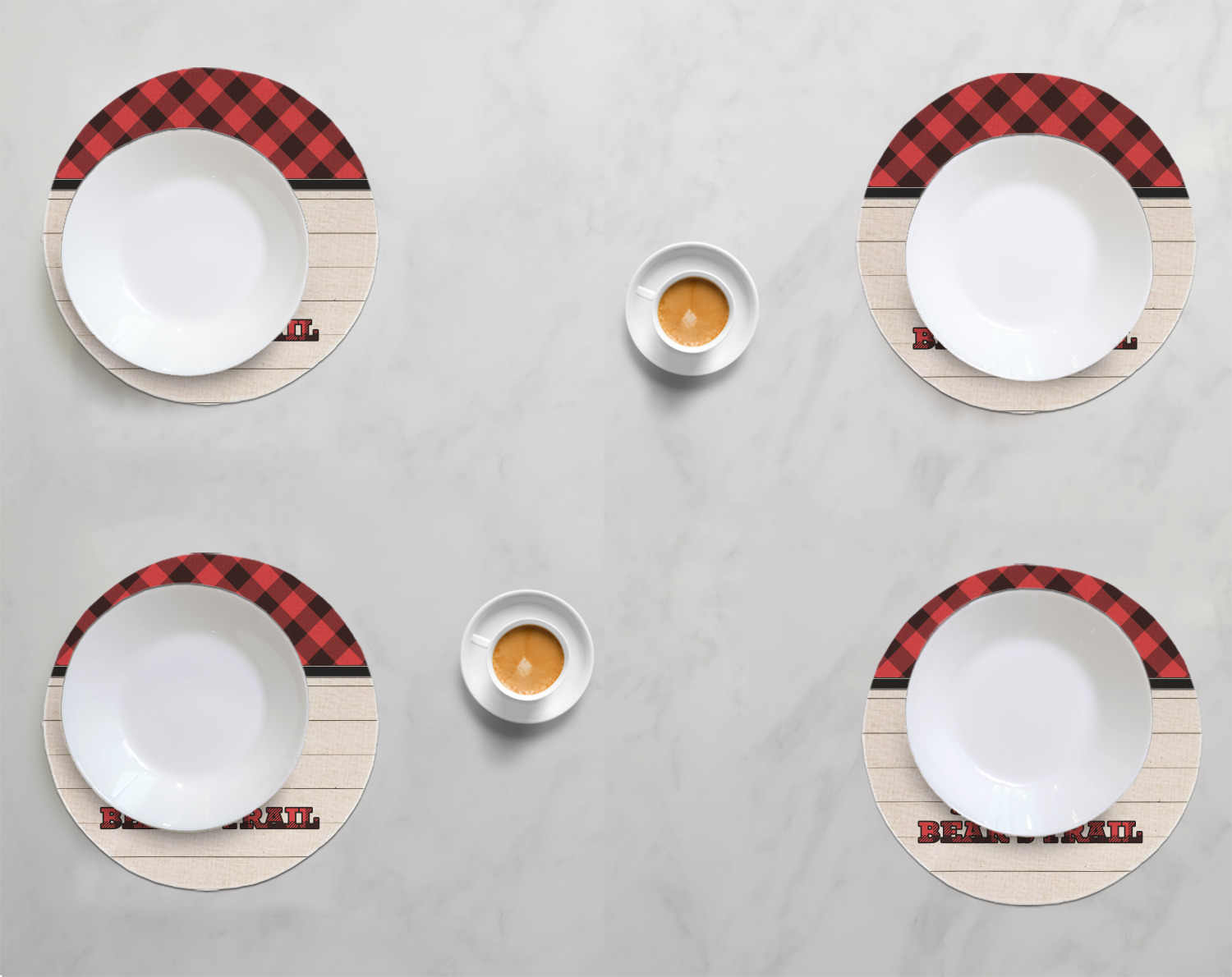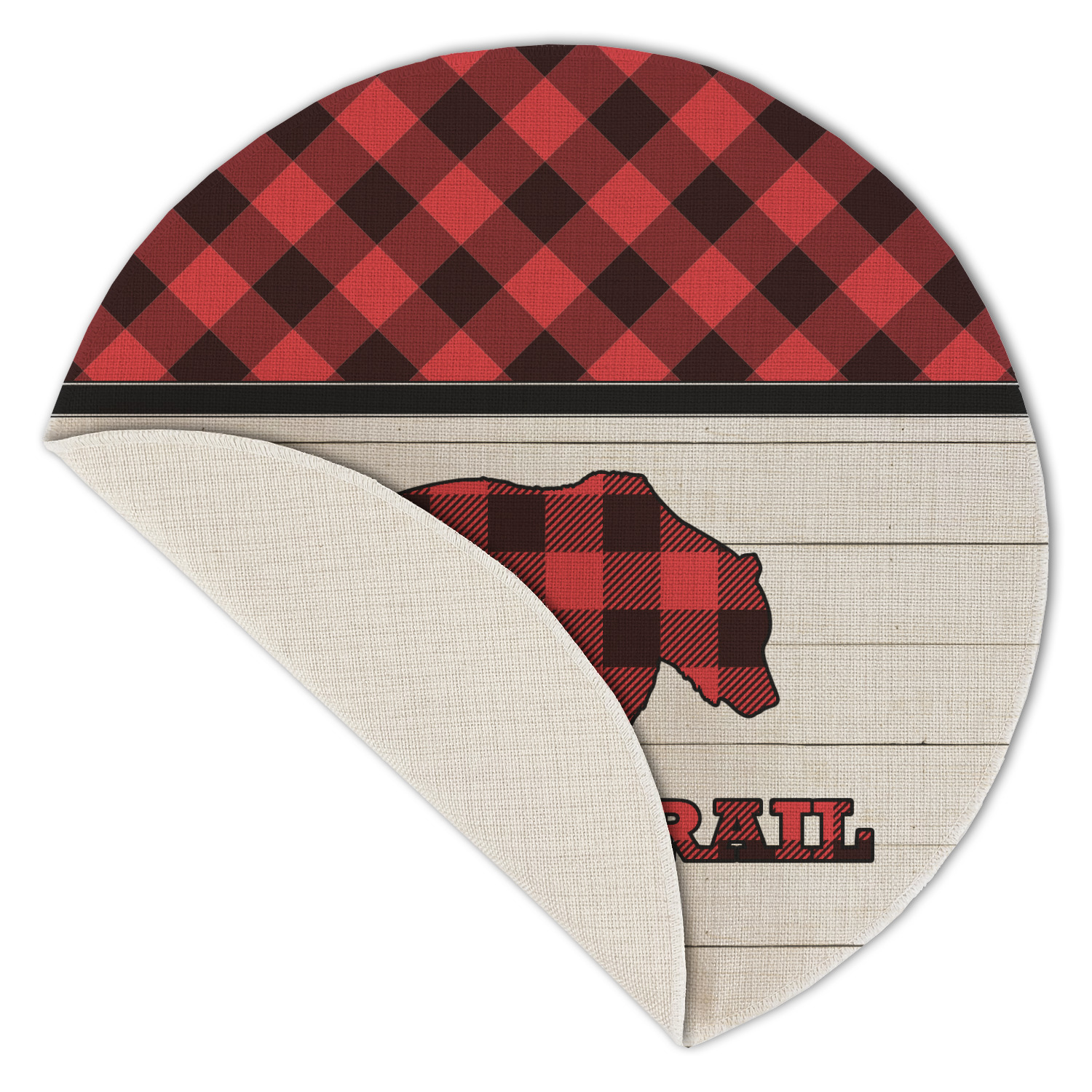 The main design is split into two asymmetrical sections. The top section is a diagonal red and black plaid, while the bottom is a light wood texture. On top of the wood texture is where your graphic and personalization go! The bear graphic and text below are filled with another black and red plaid.