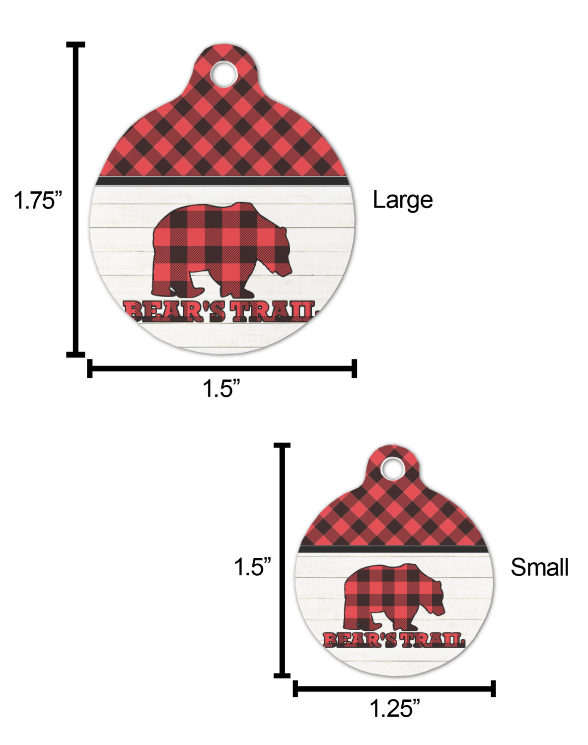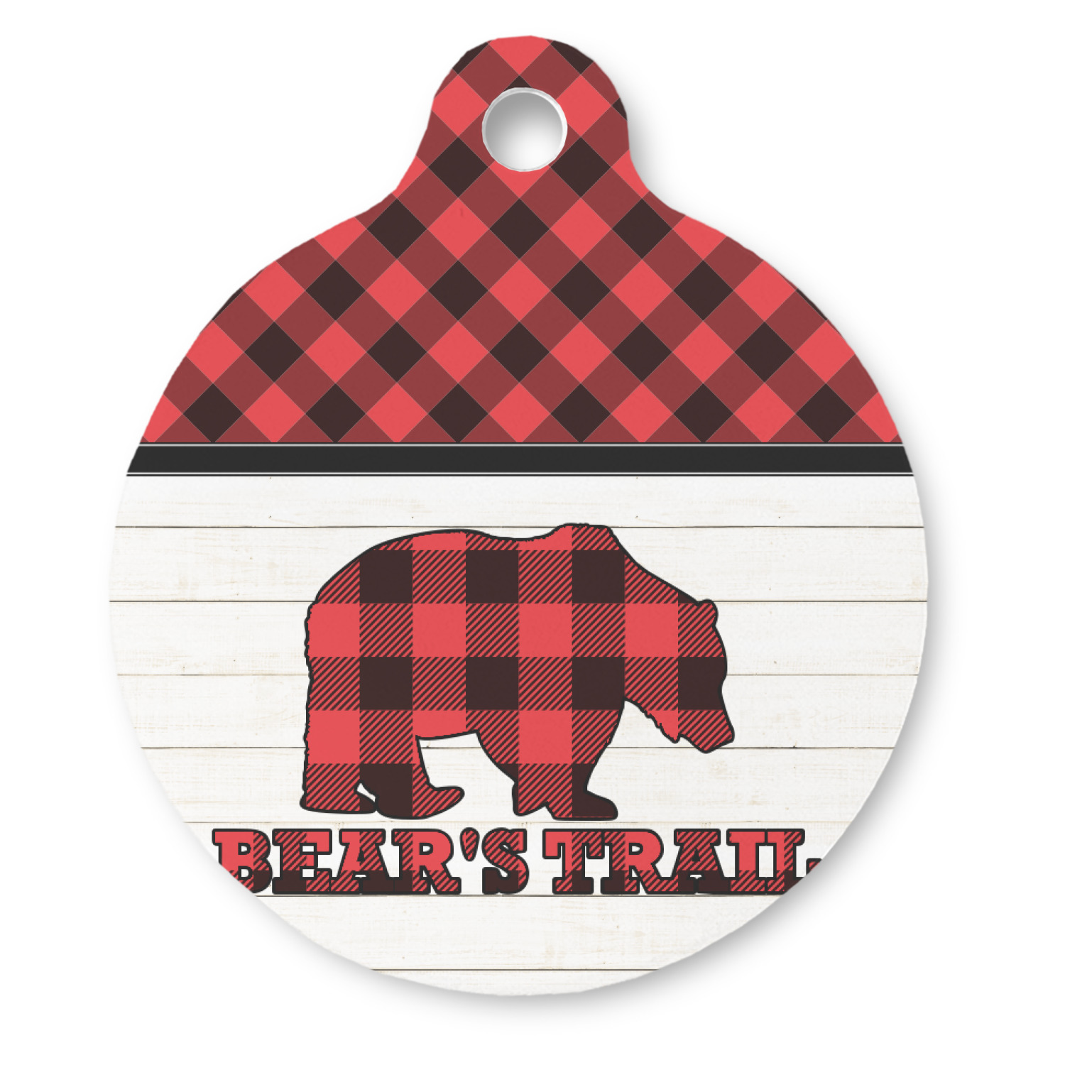 The main design is split into two asymmetrical sections. The top section is a diagonal red and black plaid, while the bottom is a light wood texture. On top of the wood texture is where your graphic and personalization go! The bear graphic and text below are filled with another black and red plaid.