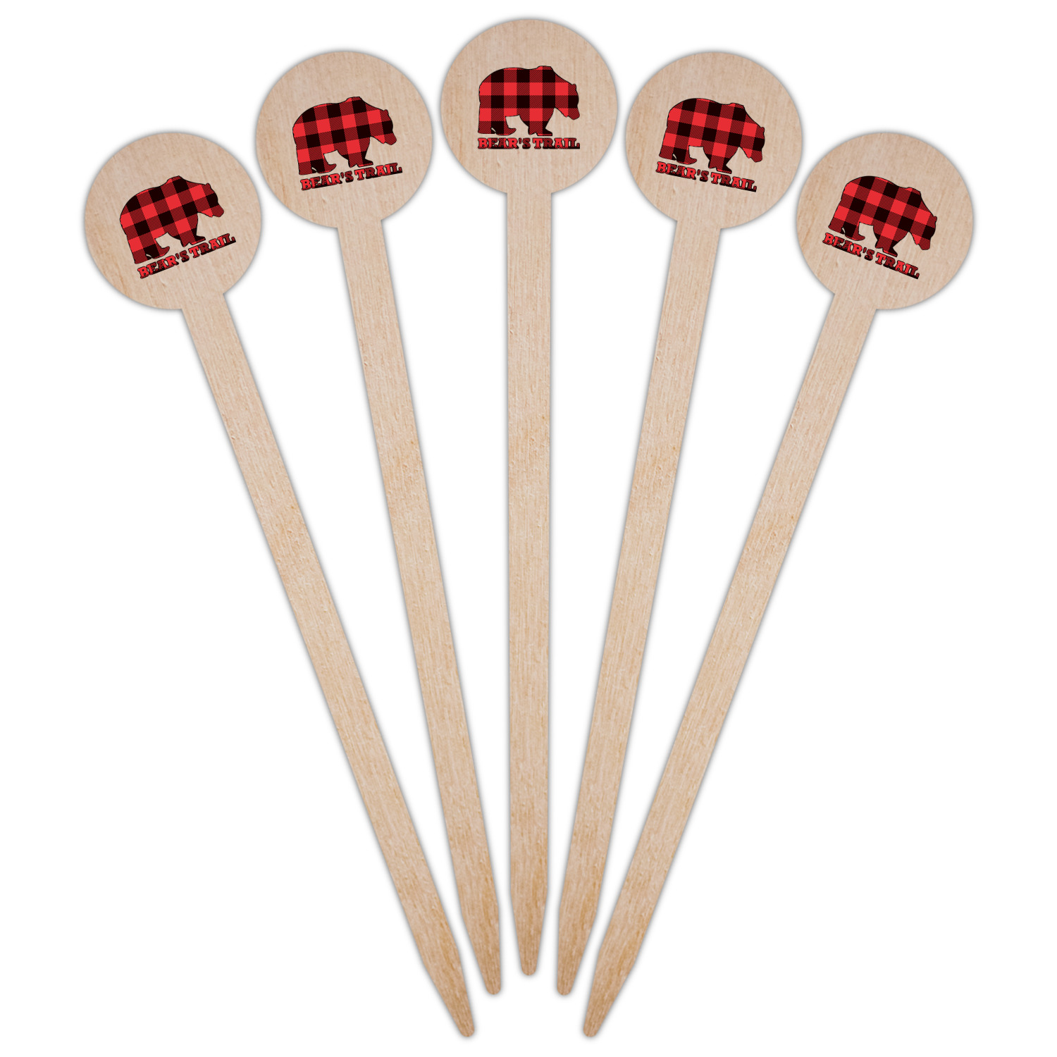 The main design is split into two asymmetrical sections. The top section is a diagonal red and black plaid, while the bottom is a light wood texture. On top of the wood texture is where your graphic and personalization go! The bear graphic and text below are filled with another black and red plaid.