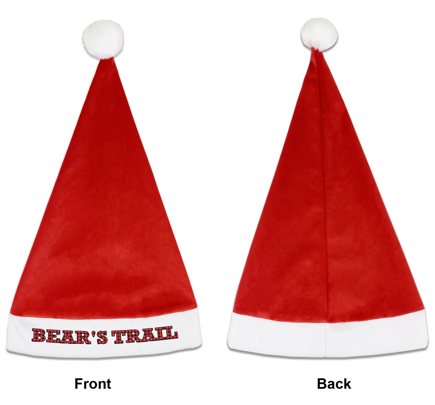 Our Santa hats are a soft, velvety polyester material. These customizable Santa hats are a classic red with white brimming and pom pom ball hanging off the hat tail just like Santa Claus! Each personalized Santa hat is approximately 17.5 L x 11.8 W. We offer two different styles to print your designs on the white brim - front or front & back.