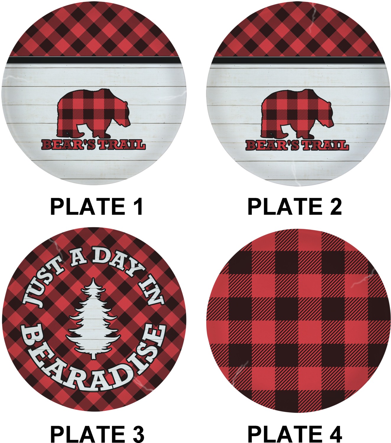 The main design is split into two asymmetrical sections. The top section is a diagonal red and black plaid, while the bottom is a light wood texture. On top of the wood texture is where your graphic and personalization go! The bear graphic and text below are filled with another black and red plaid.