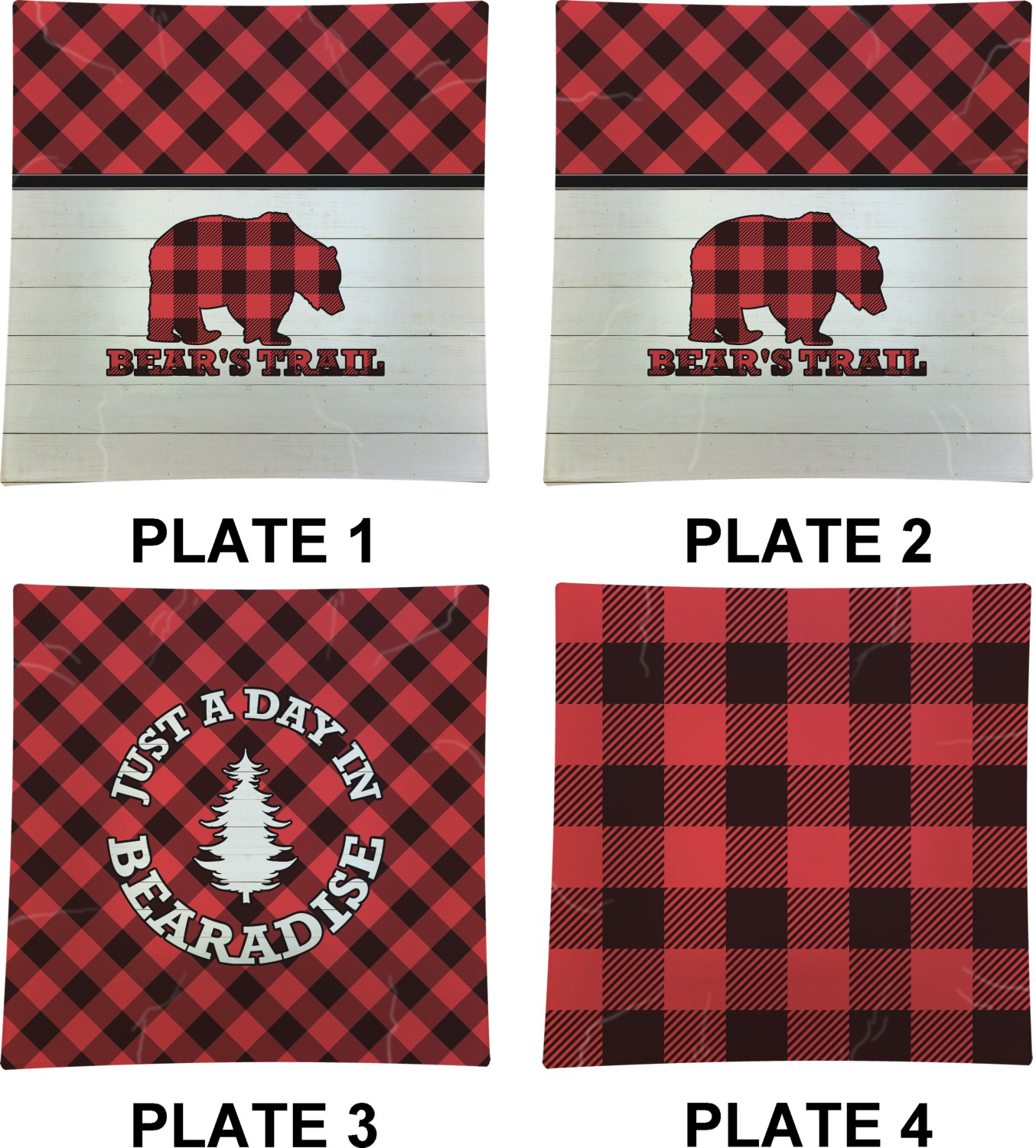The main design is split into two asymmetrical sections. The top section is a diagonal red and black plaid, while the bottom is a light wood texture. On top of the wood texture is where your graphic and personalization go! The bear graphic and text below are filled with another black and red plaid.