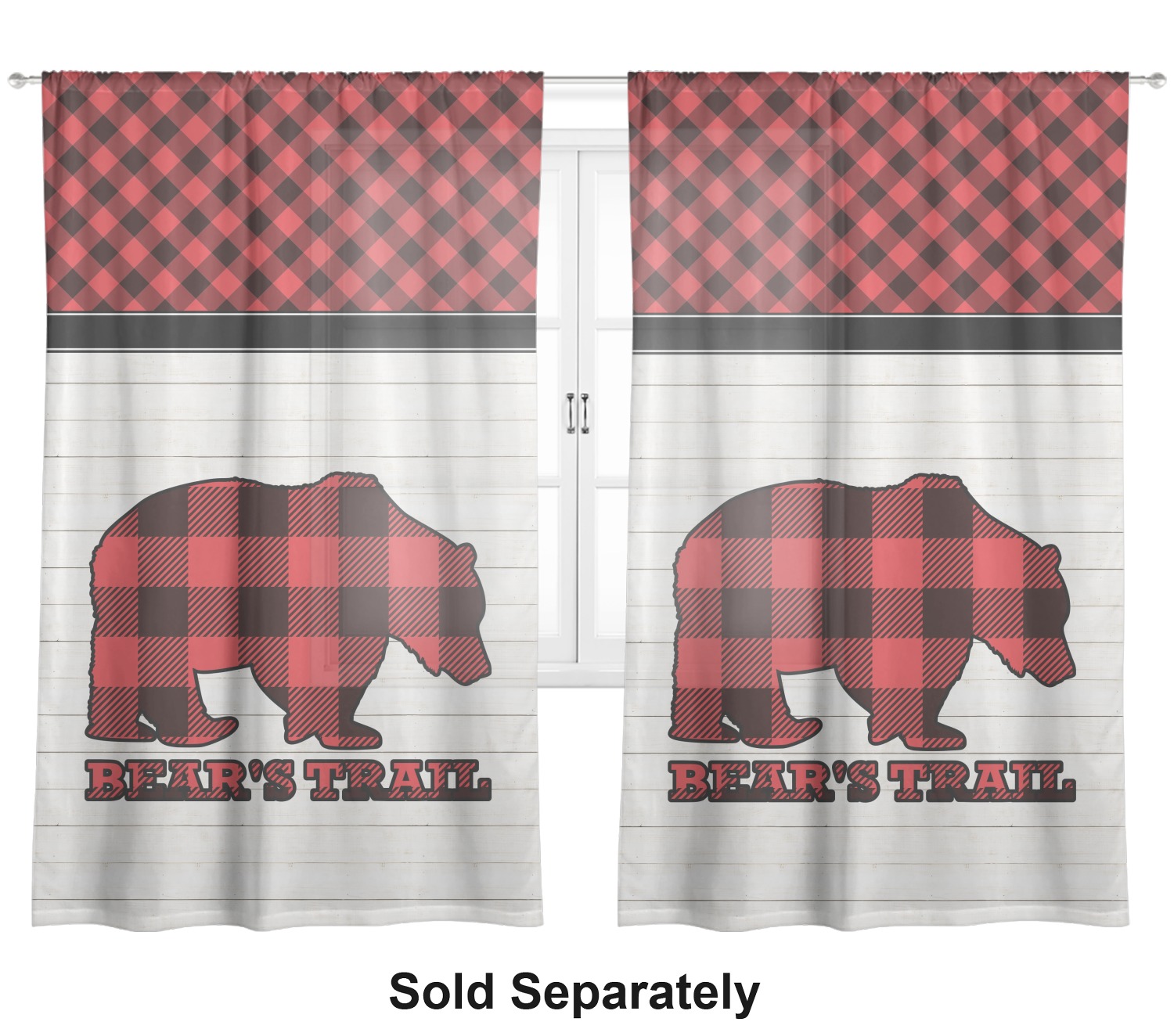 The main design is split into two asymmetrical sections. The top section is a diagonal red and black plaid, while the bottom is a light wood texture. On top of the wood texture is where your graphic and personalization go! The bear graphic and text below are filled with another black and red plaid.