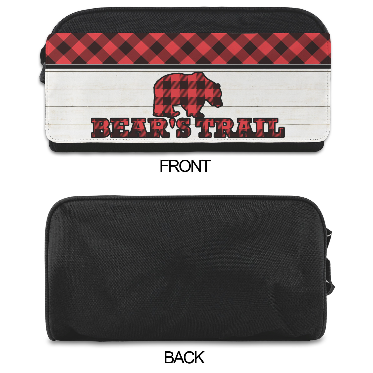 The main design is split into two asymmetrical sections. The top section is a diagonal red and black plaid, while the bottom is a light wood texture. On top of the wood texture is where your graphic and personalization go! The bear graphic and text below are filled with another black and red plaid.