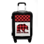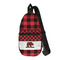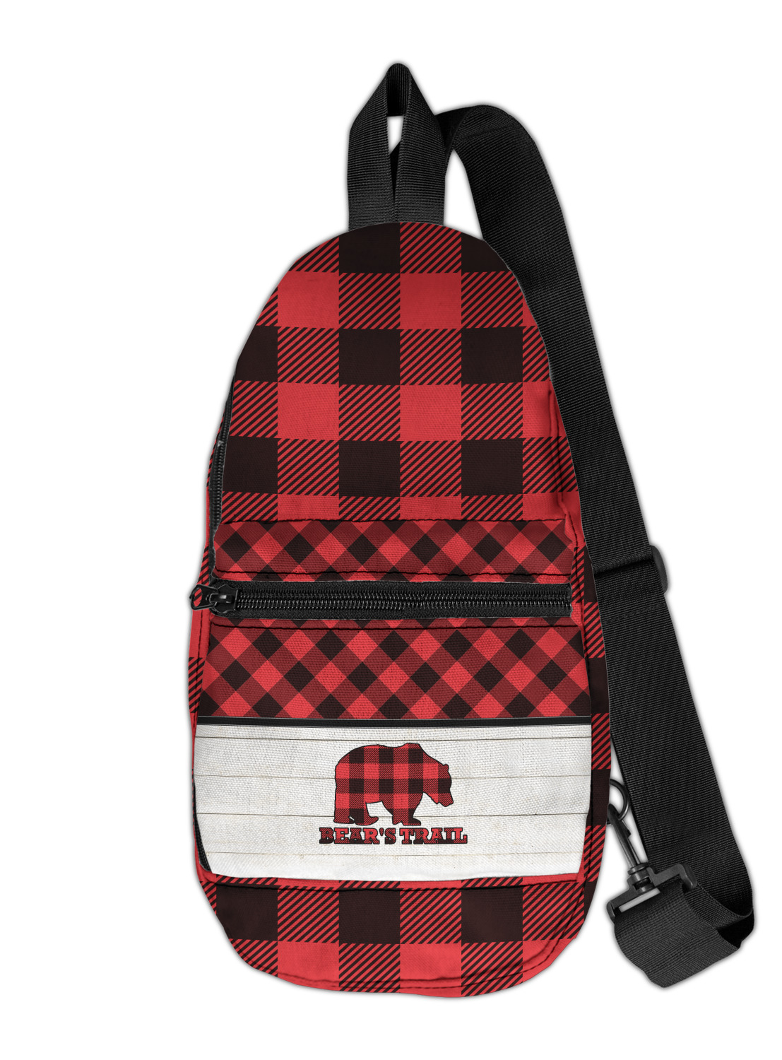 The main design is split into two asymmetrical sections. The top section is a diagonal red and black plaid, while the bottom is a light wood texture. On top of the wood texture is where your graphic and personalization go! The bear graphic and text below are filled with another black and red plaid.
