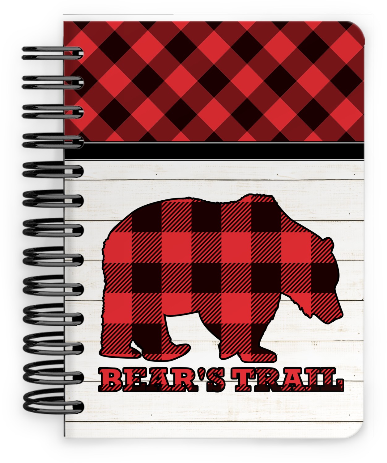 The main design is split into two asymmetrical sections. The top section is a diagonal red and black plaid, while the bottom is a light wood texture. On top of the wood texture is where your graphic and personalization go! The bear graphic and text below are filled with another black and red plaid.