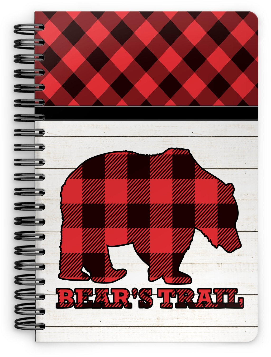 The main design is split into two asymmetrical sections. The top section is a diagonal red and black plaid, while the bottom is a light wood texture. On top of the wood texture is where your graphic and personalization go! The bear graphic and text below are filled with another black and red plaid.