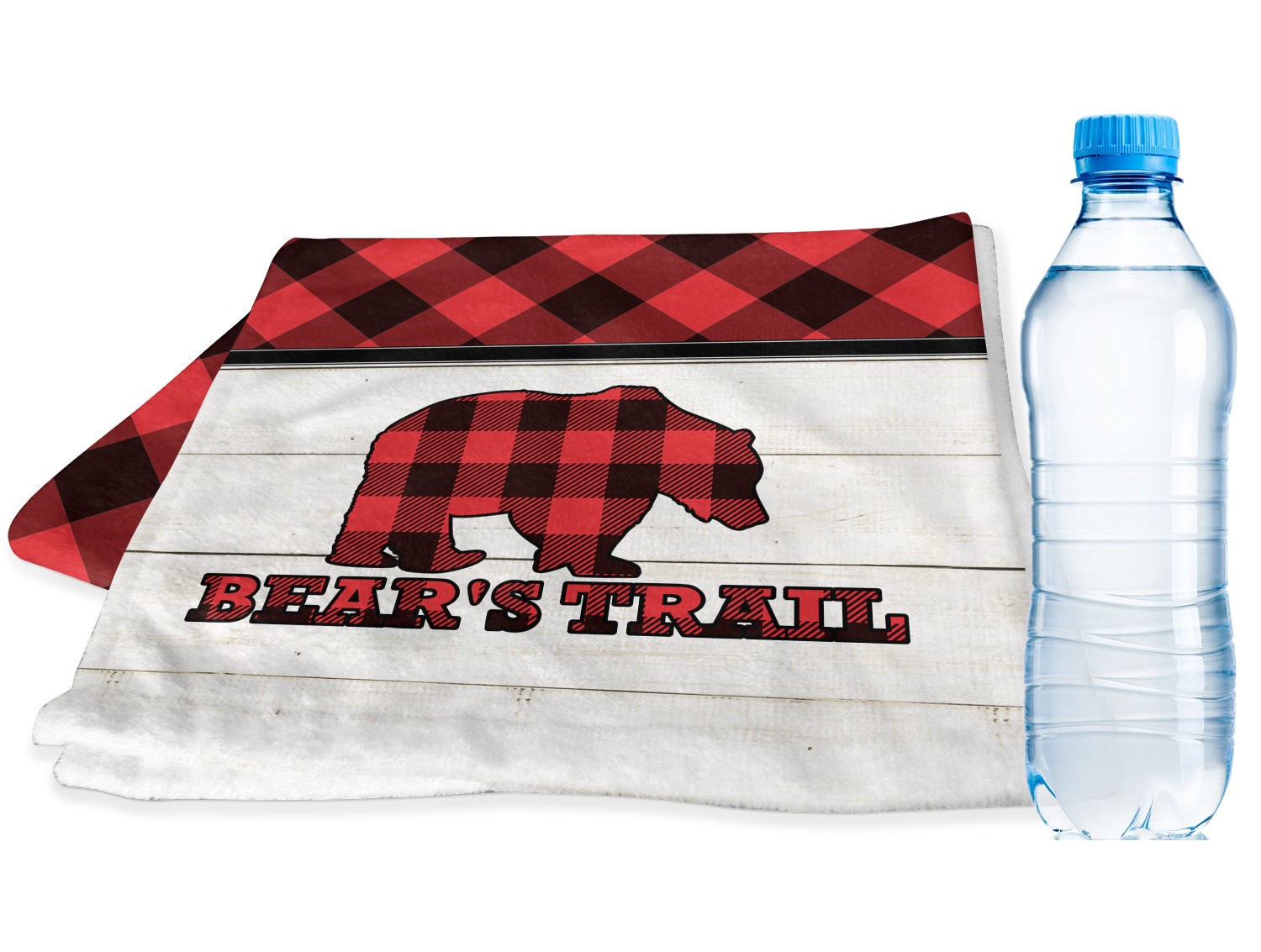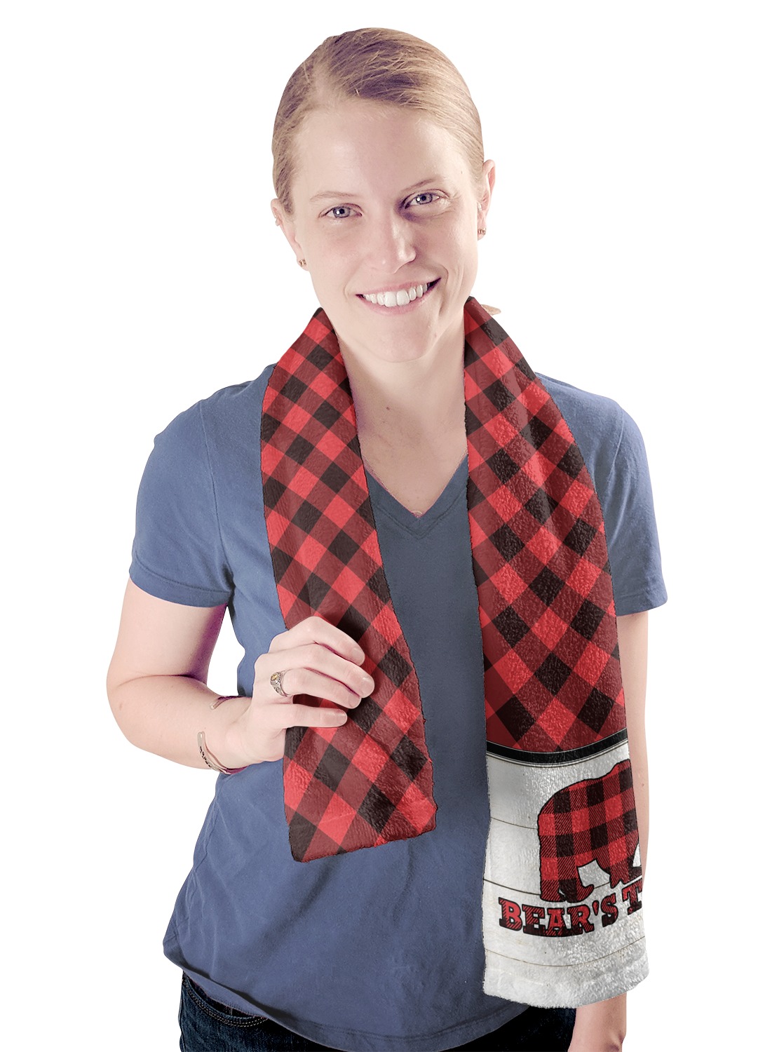 The main design is split into two asymmetrical sections. The top section is a diagonal red and black plaid, while the bottom is a light wood texture. On top of the wood texture is where your graphic and personalization go! The bear graphic and text below are filled with another black and red plaid.