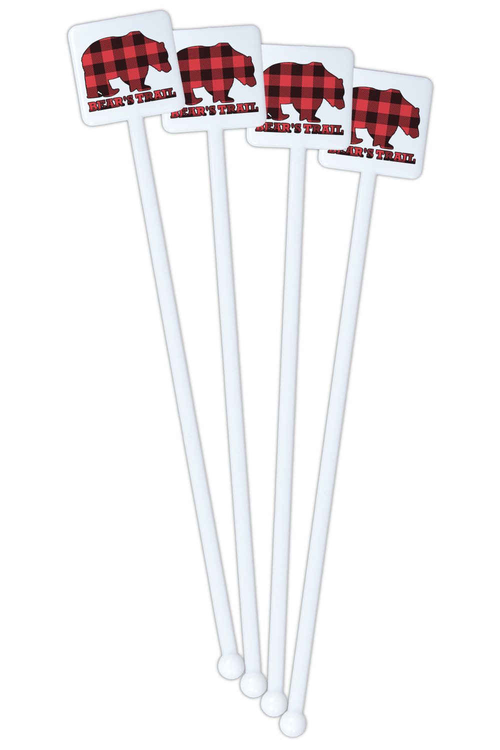 The main design is split into two asymmetrical sections. The top section is a diagonal red and black plaid, while the bottom is a light wood texture. On top of the wood texture is where your graphic and personalization go! The bear graphic and text below are filled with another black and red plaid.