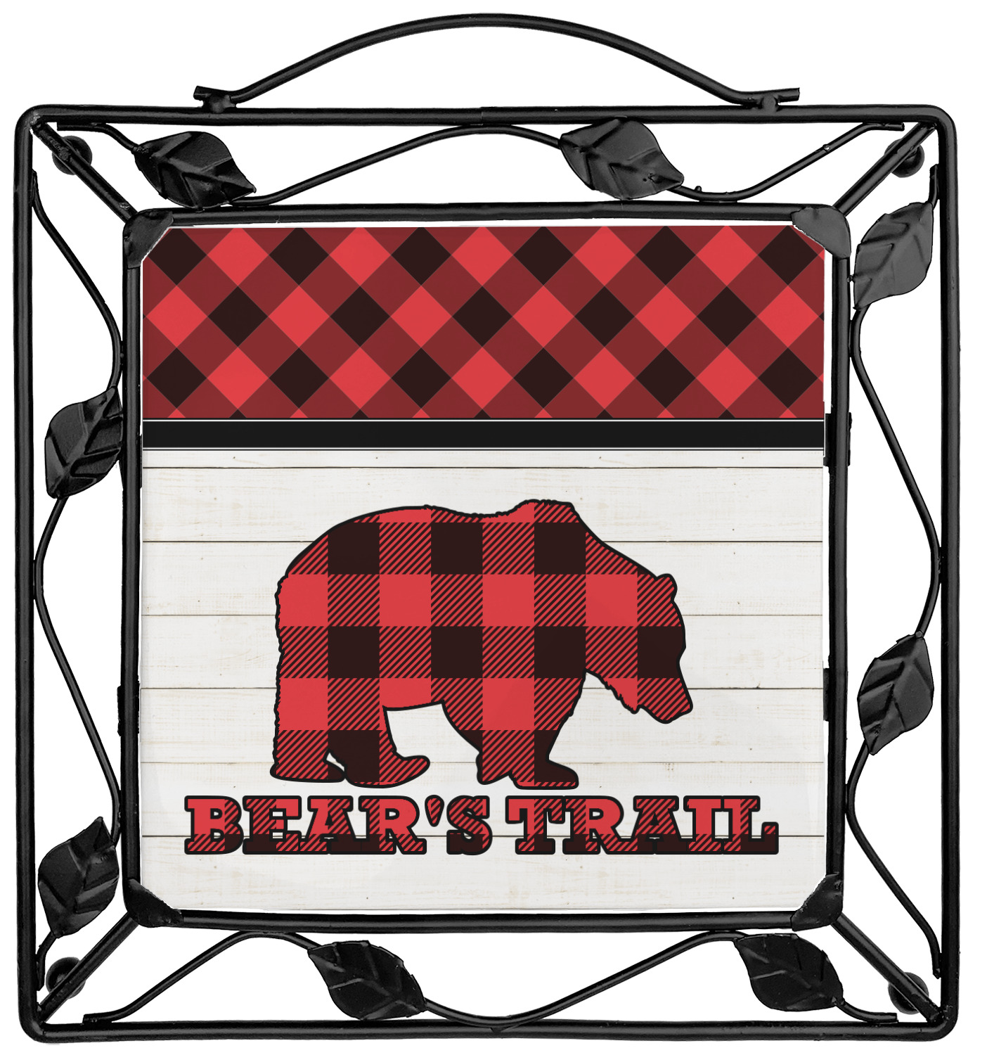 Our square trivets are made from a durable, wrought iron. This model features 4 small half circles, one on each corner, and a larger ring of iron that circles the central, customized tile. Each of the 4 corners has a round foot on its bottom for stability. This trivet is 8.75 by 8.75 inches, but the central tile measures at 6 inches on both sides.