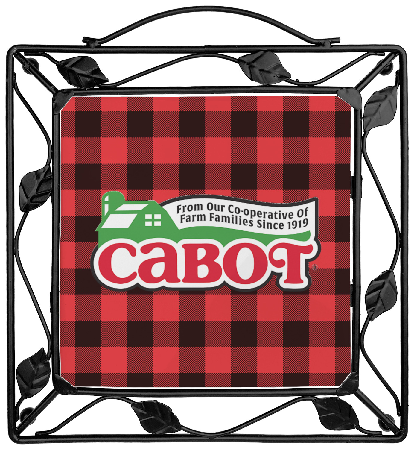 Our square trivets are made from a durable, wrought iron. This model features 4 small half circles, one on each corner, and a larger ring of iron that circles the central, customized tile. Each of the 4 corners has a round foot on its bottom for stability. This trivet is 8.75 by 8.75 inches, but the central tile measures at 6 inches on both sides.