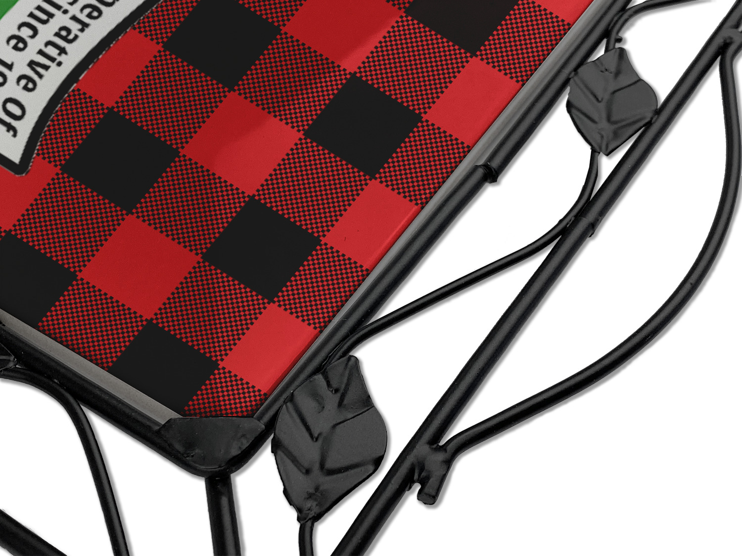 The coordinating design has a pine tree filled with a wood texture and text surrounding it. All this sits on a black and red plaid background.