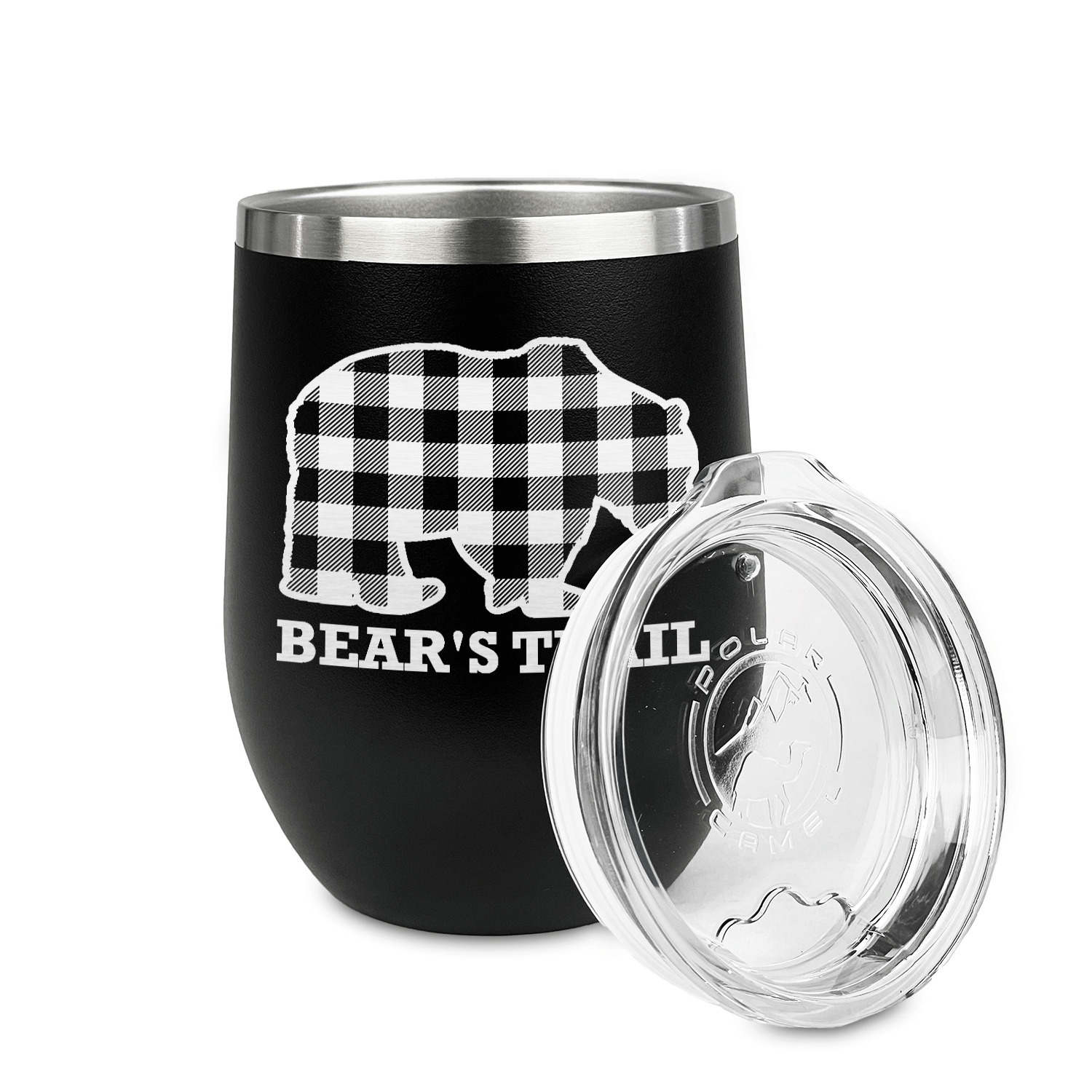 The main design is split into two asymmetrical sections. The top section is a diagonal red and black plaid, while the bottom is a light wood texture. On top of the wood texture is where your graphic and personalization go! The bear graphic and text below are filled with another black and red plaid.