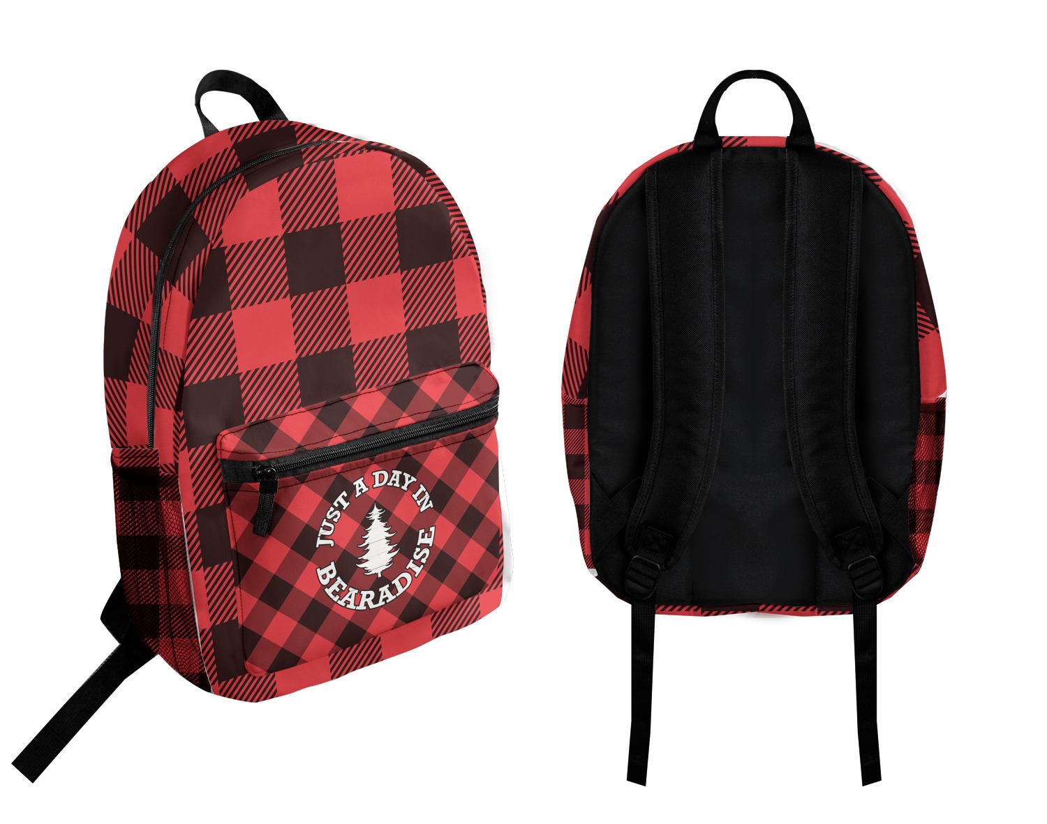The main design is split into two asymmetrical sections. The top section is a diagonal red and black plaid, while the bottom is a light wood texture. On top of the wood texture is where your graphic and personalization go! The bear graphic and text below are filled with another black and red plaid.