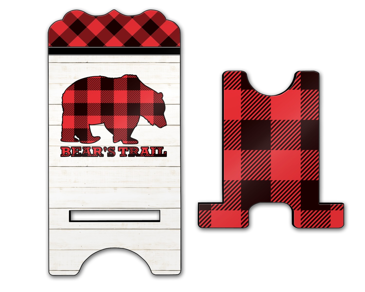 The main design is split into two asymmetrical sections. The top section is a diagonal red and black plaid, while the bottom is a light wood texture. On top of the wood texture is where your graphic and personalization go! The bear graphic and text below are filled with another black and red plaid.