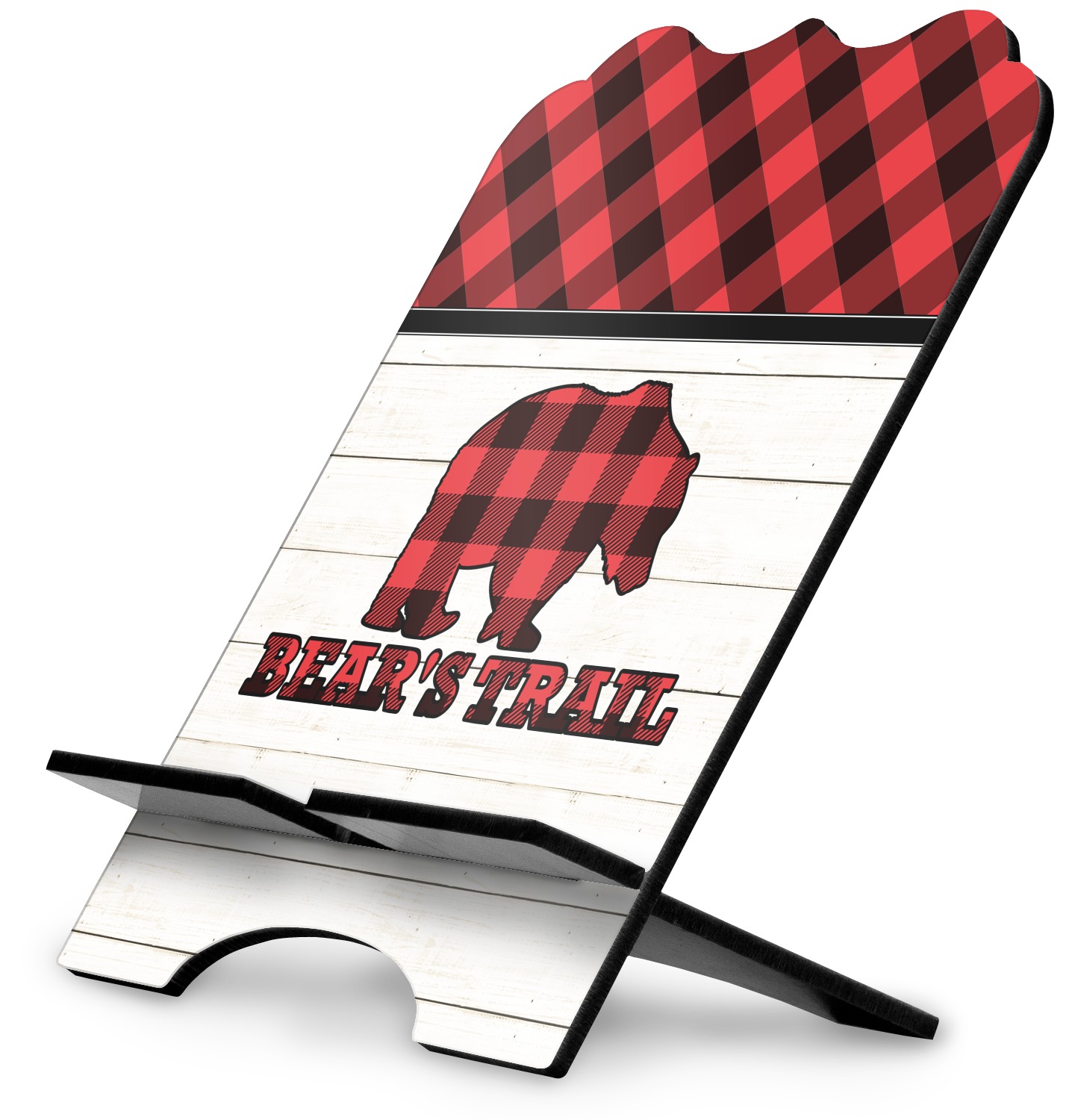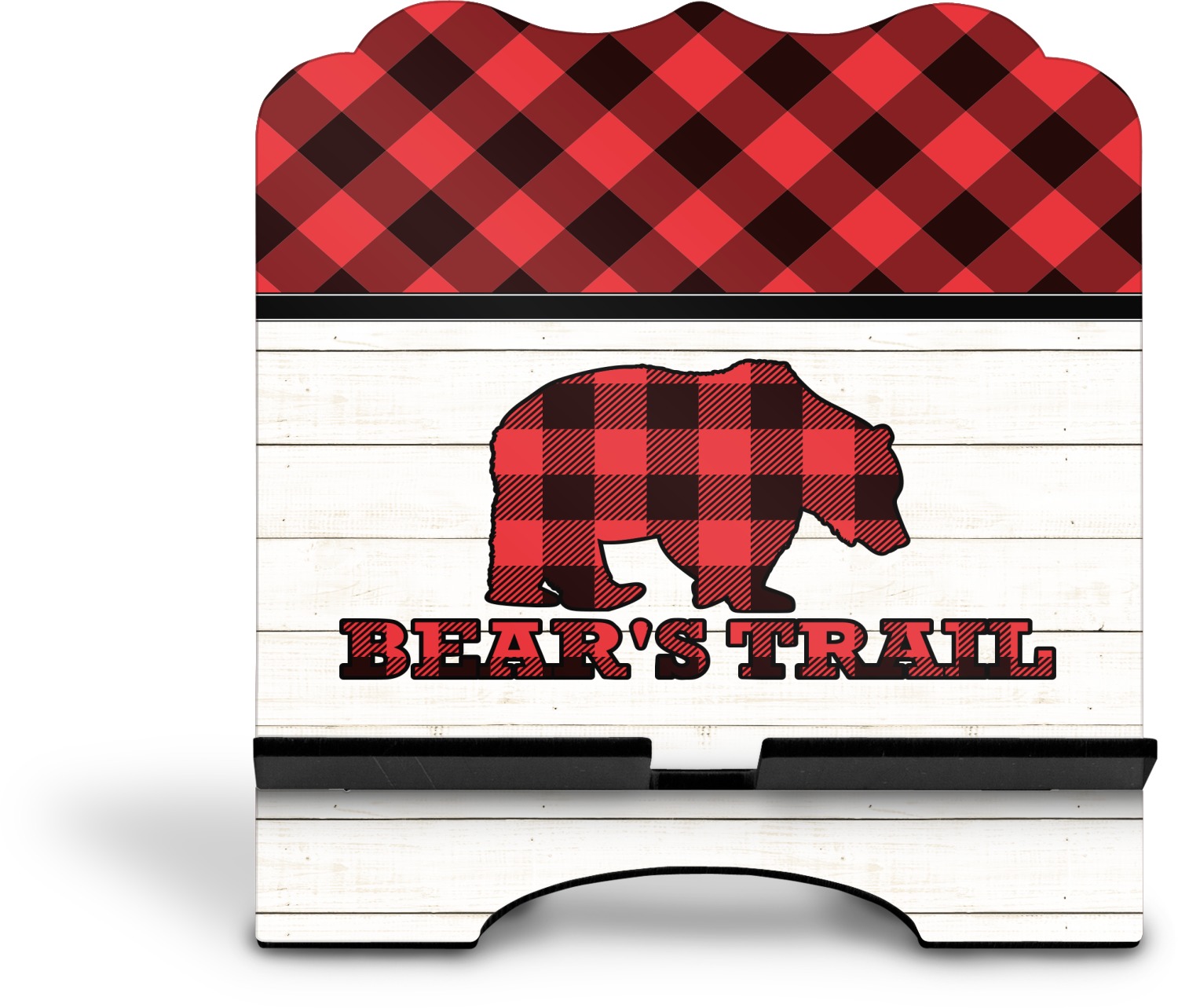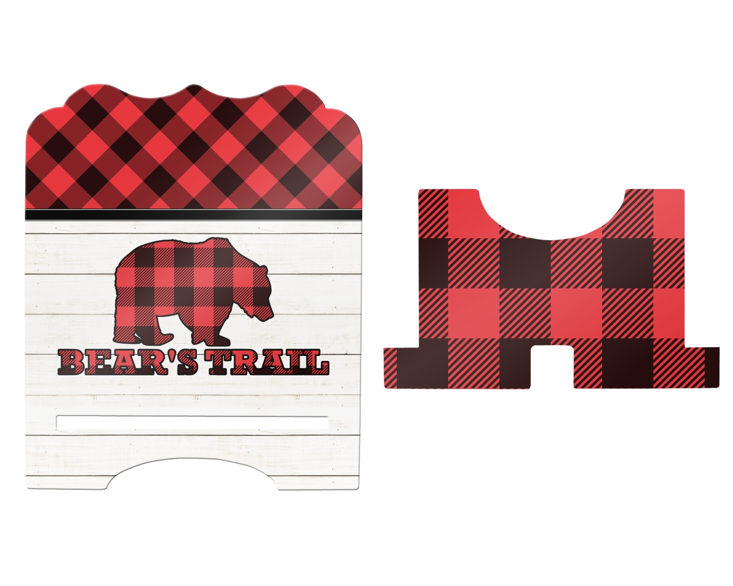 The main design is split into two asymmetrical sections. The top section is a diagonal red and black plaid, while the bottom is a light wood texture. On top of the wood texture is where your graphic and personalization go! The bear graphic and text below are filled with another black and red plaid.