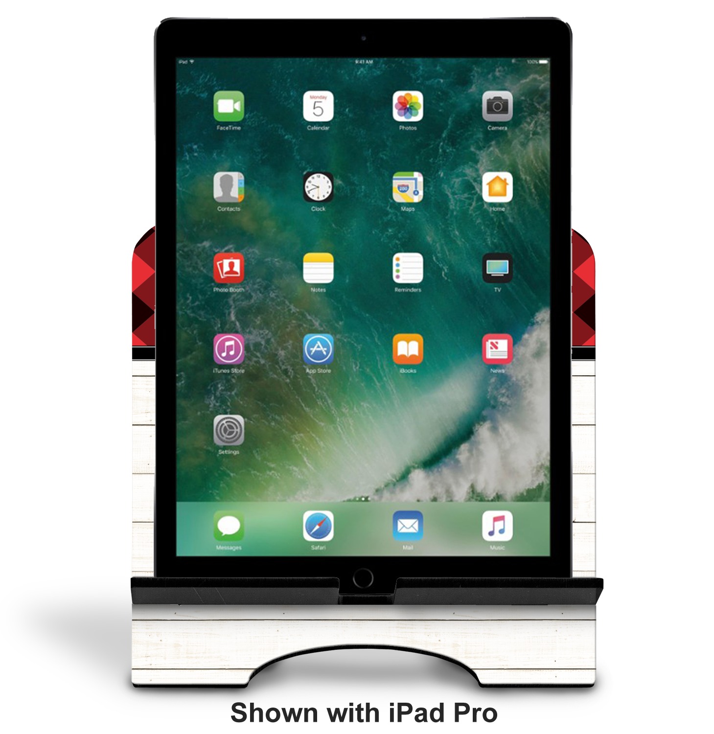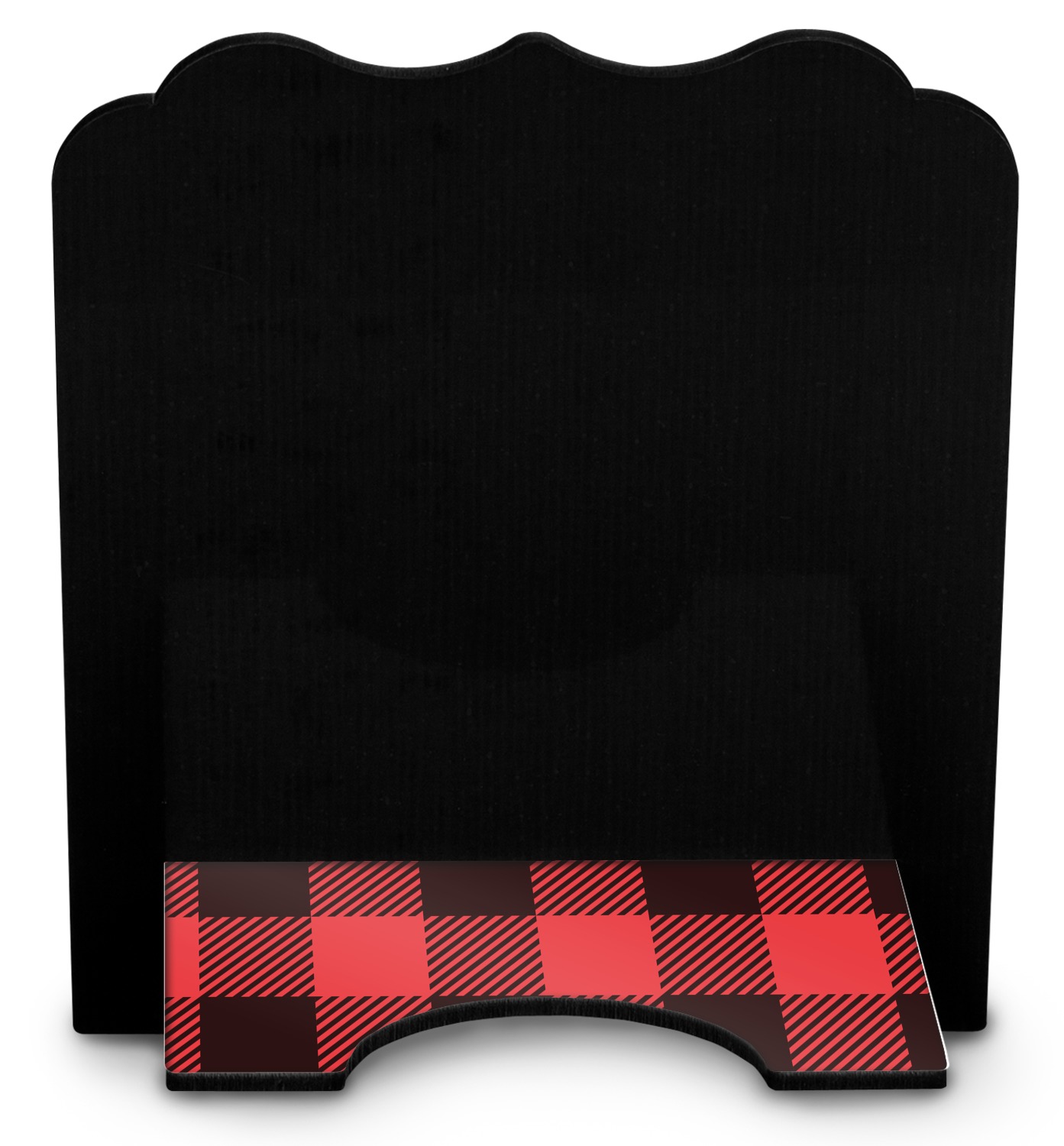 The stand is comprised of two hardboard pieces that fit snugly together and stabilize one another. The bottom part of the iPad stand supports your tablet, and has space for your tablets charger while in use. At 9.25" x 11.5", this tablet mount can support a device between the sizes of the iPad Pro and the iPad Mini 2. The uppermost part of the stand features a decorative, curved edge for a classy, suave appearance. We print your customization atop the face of the stand, in vibrant color. The remaining sides are colored a sleek black.