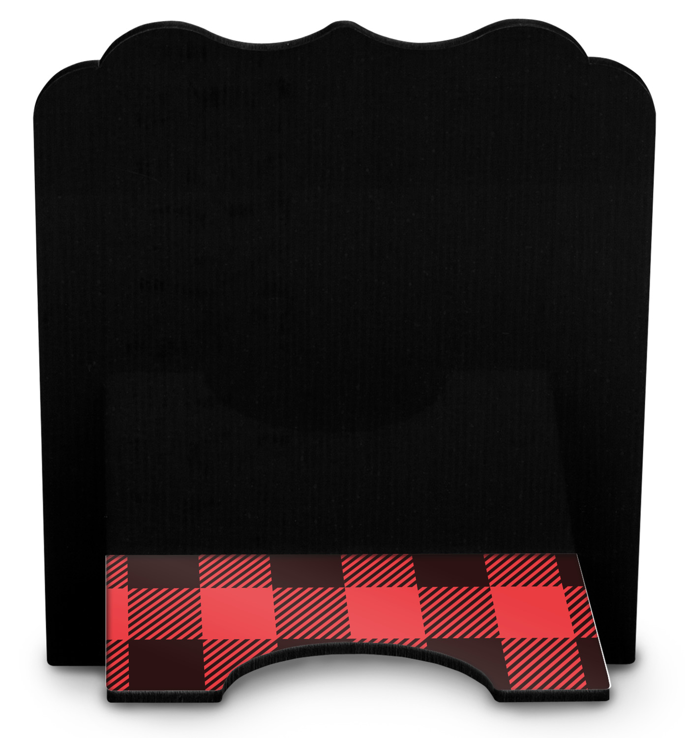 The main design is split into two asymmetrical sections. The top section is a diagonal red and black plaid, while the bottom is a light wood texture. On top of the wood texture is where your graphic and personalization go! The bear graphic and text below are filled with another black and red plaid.