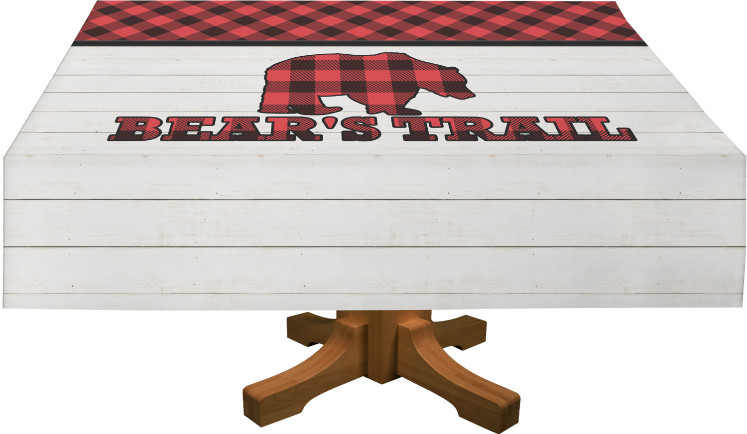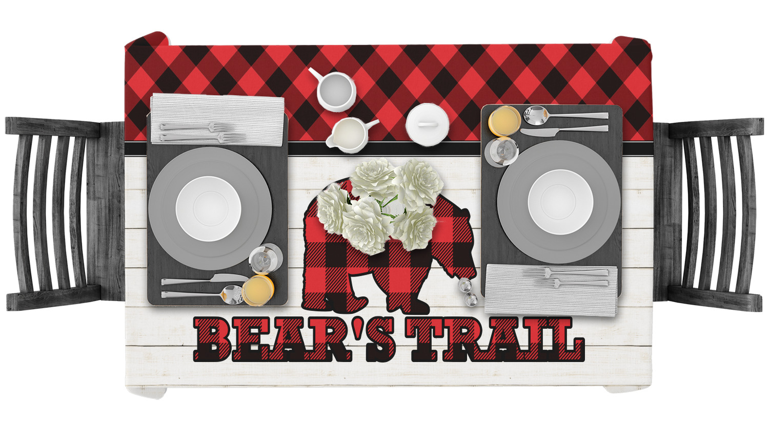 The main design is split into two asymmetrical sections. The top section is a diagonal red and black plaid, while the bottom is a light wood texture. On top of the wood texture is where your graphic and personalization go! The bear graphic and text below are filled with another black and red plaid.