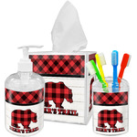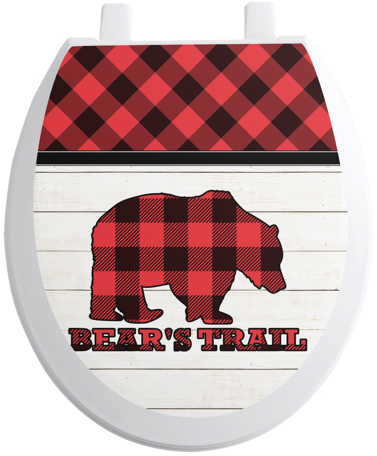 The main design is split into two asymmetrical sections. The top section is a diagonal red and black plaid, while the bottom is a light wood texture. On top of the wood texture is where your graphic and personalization go! The bear graphic and text below are filled with another black and red plaid.