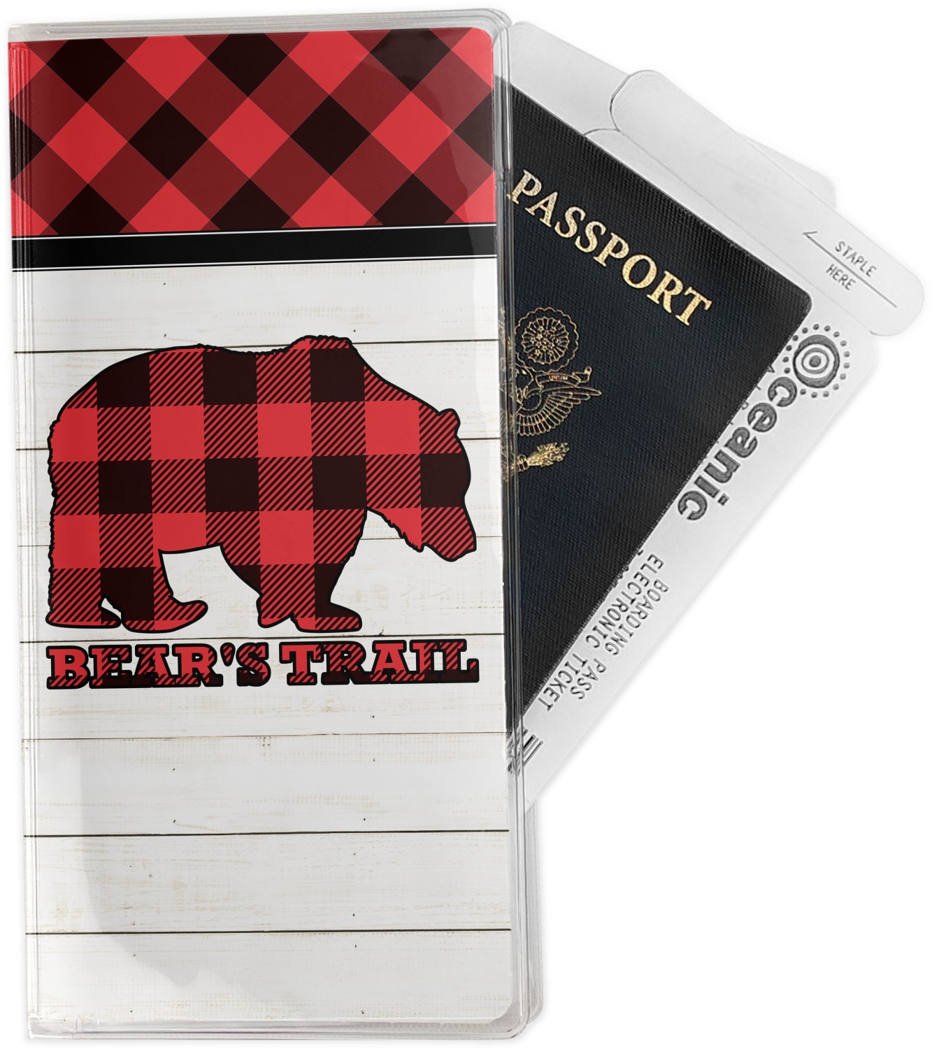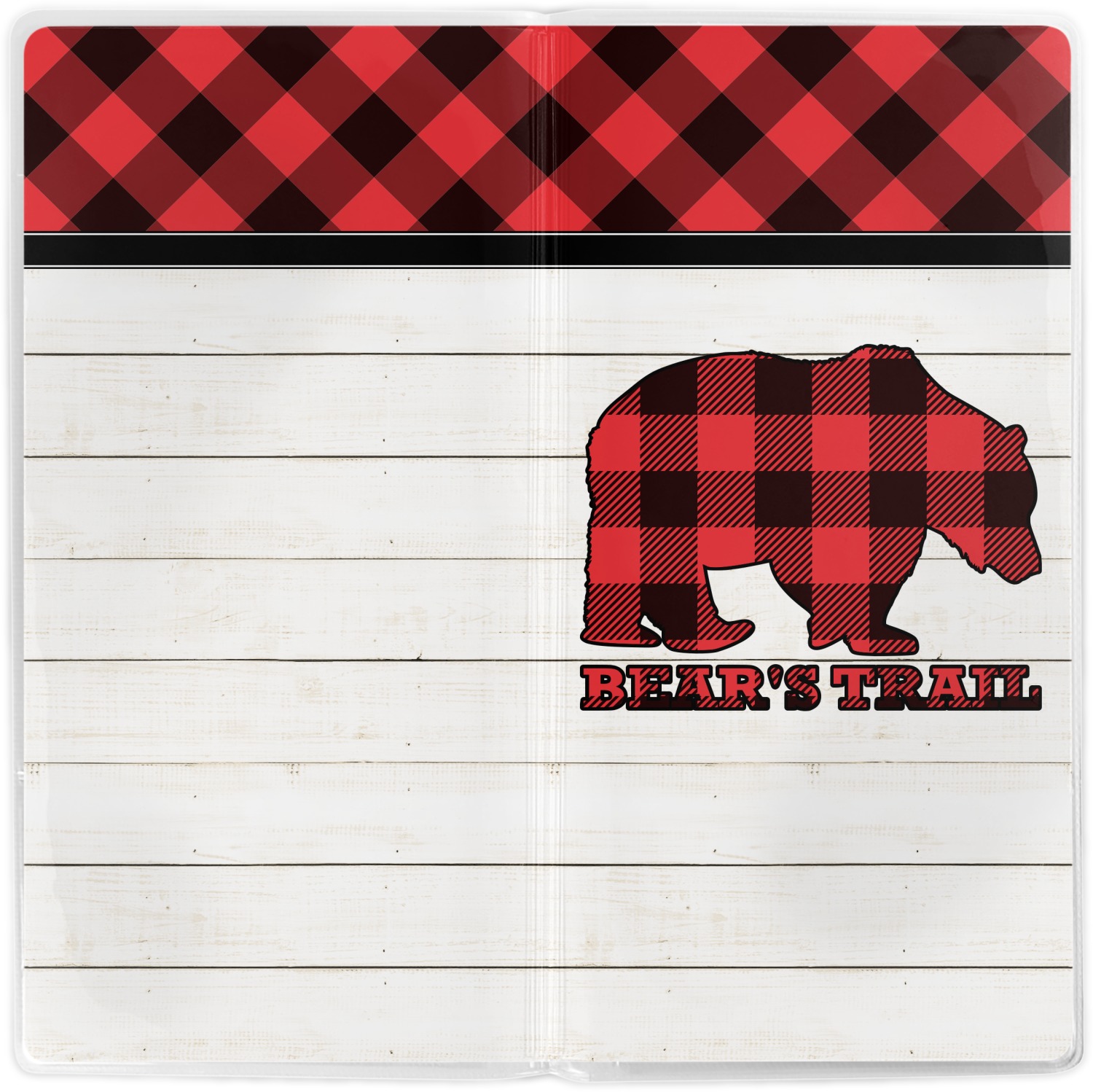 The main design is split into two asymmetrical sections. The top section is a diagonal red and black plaid, while the bottom is a light wood texture. On top of the wood texture is where your graphic and personalization go! The bear graphic and text below are filled with another black and red plaid.