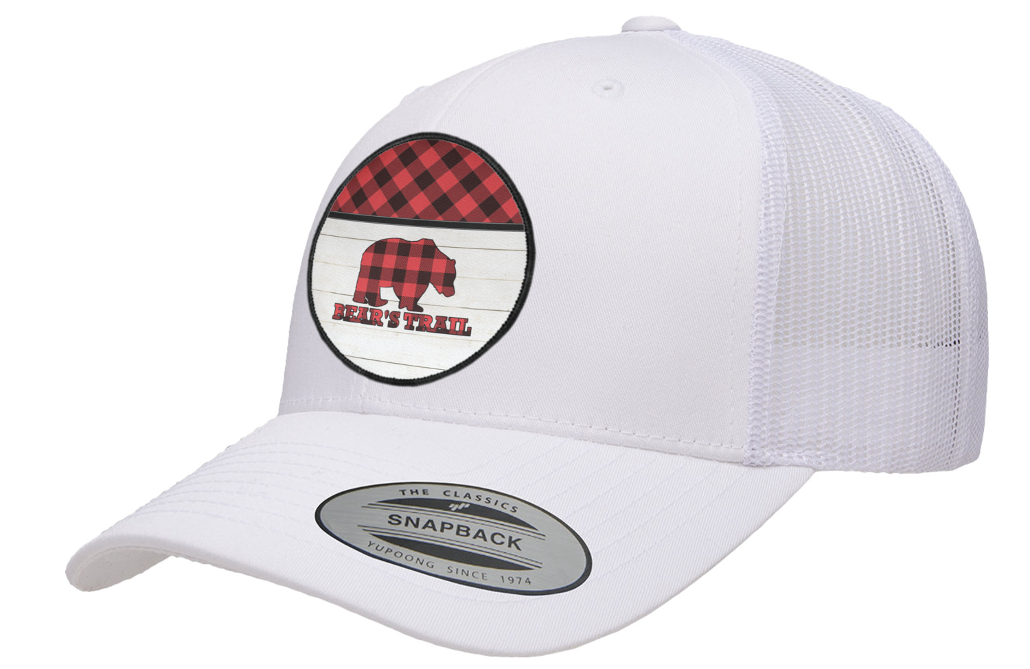 The main design is split into two asymmetrical sections. The top section is a diagonal red and black plaid, while the bottom is a light wood texture. On top of the wood texture is where your graphic and personalization go! The bear graphic and text below are filled with another black and red plaid.