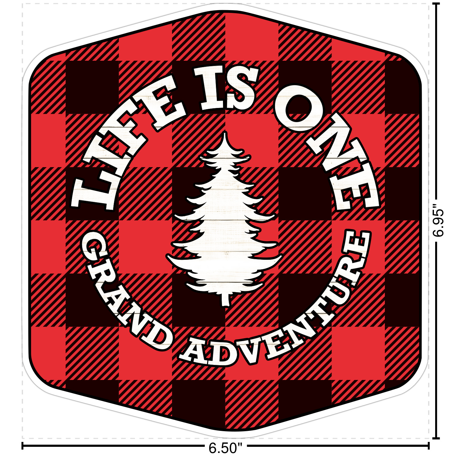 The coordinating design has a pine tree filled with a wood texture and text surrounding it. All this sits on a black and red plaid background.