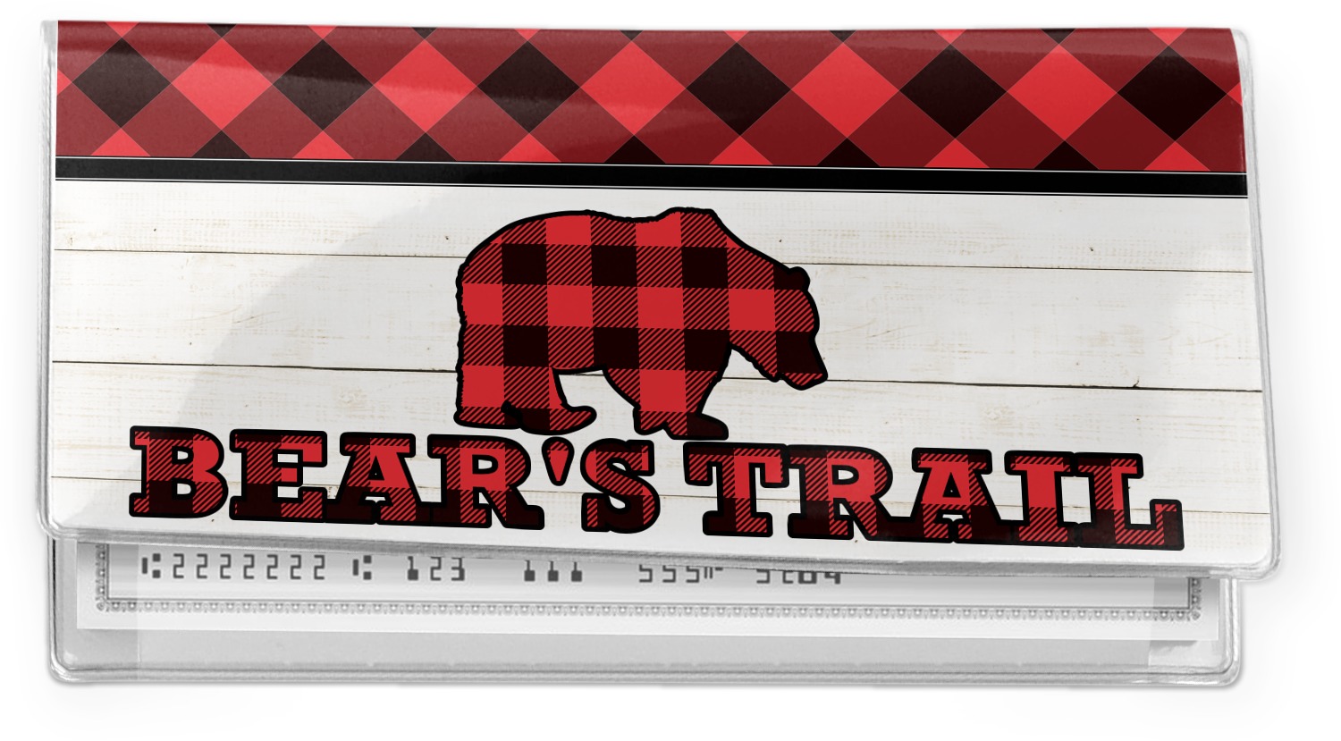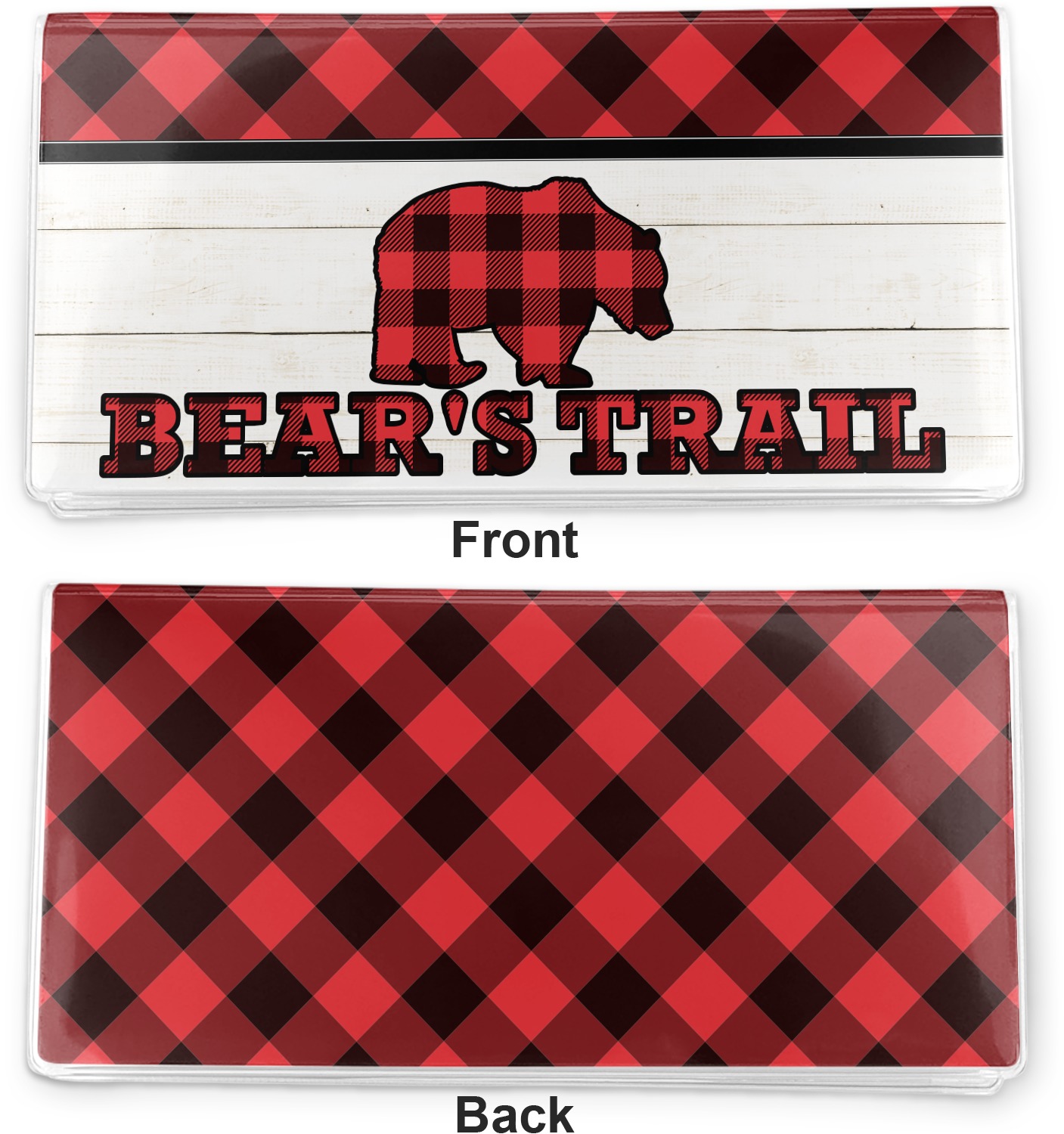 The main design is split into two asymmetrical sections. The top section is a diagonal red and black plaid, while the bottom is a light wood texture. On top of the wood texture is where your graphic and personalization go! The bear graphic and text below are filled with another black and red plaid.