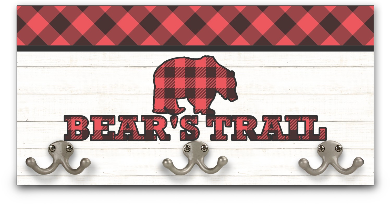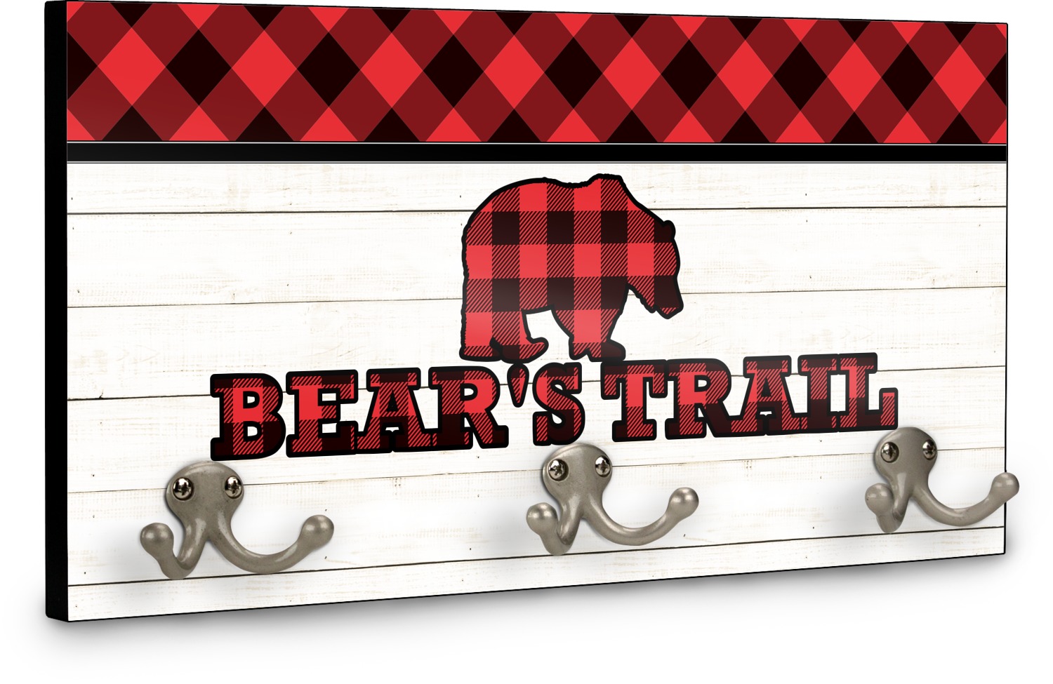 The main design is split into two asymmetrical sections. The top section is a diagonal red and black plaid, while the bottom is a light wood texture. On top of the wood texture is where your graphic and personalization go! The bear graphic and text below are filled with another black and red plaid.