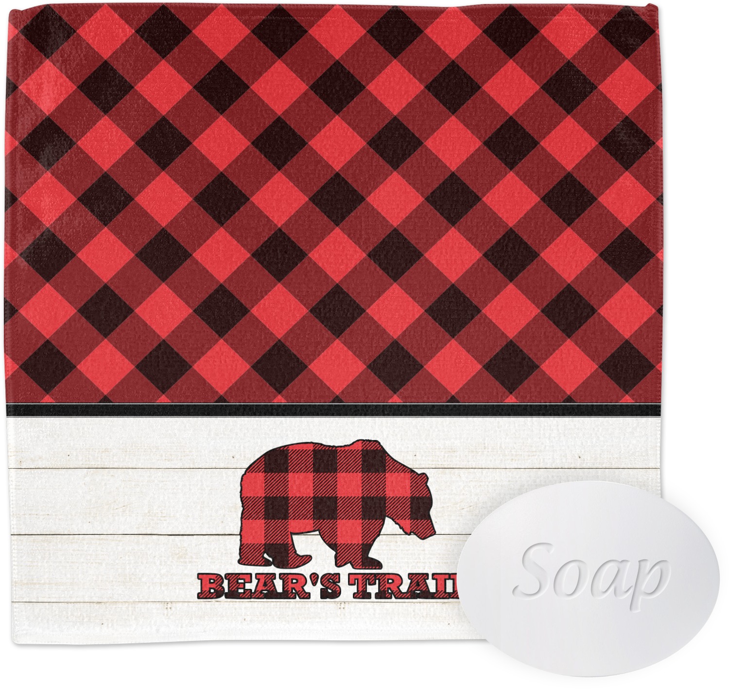 The main design is split into two asymmetrical sections. The top section is a diagonal red and black plaid, while the bottom is a light wood texture. On top of the wood texture is where your graphic and personalization go! The bear graphic and text below are filled with another black and red plaid.
